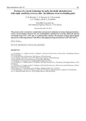 P. M. Borovkov, L. N. Kazarin, N. V. Kravchenko, A. V. Potapov, and M. A. Trishenkov Features of a circuit technology for pulse threshold photodetectors with rapid sensitivity recovery after the influence of an overloading pulse 61