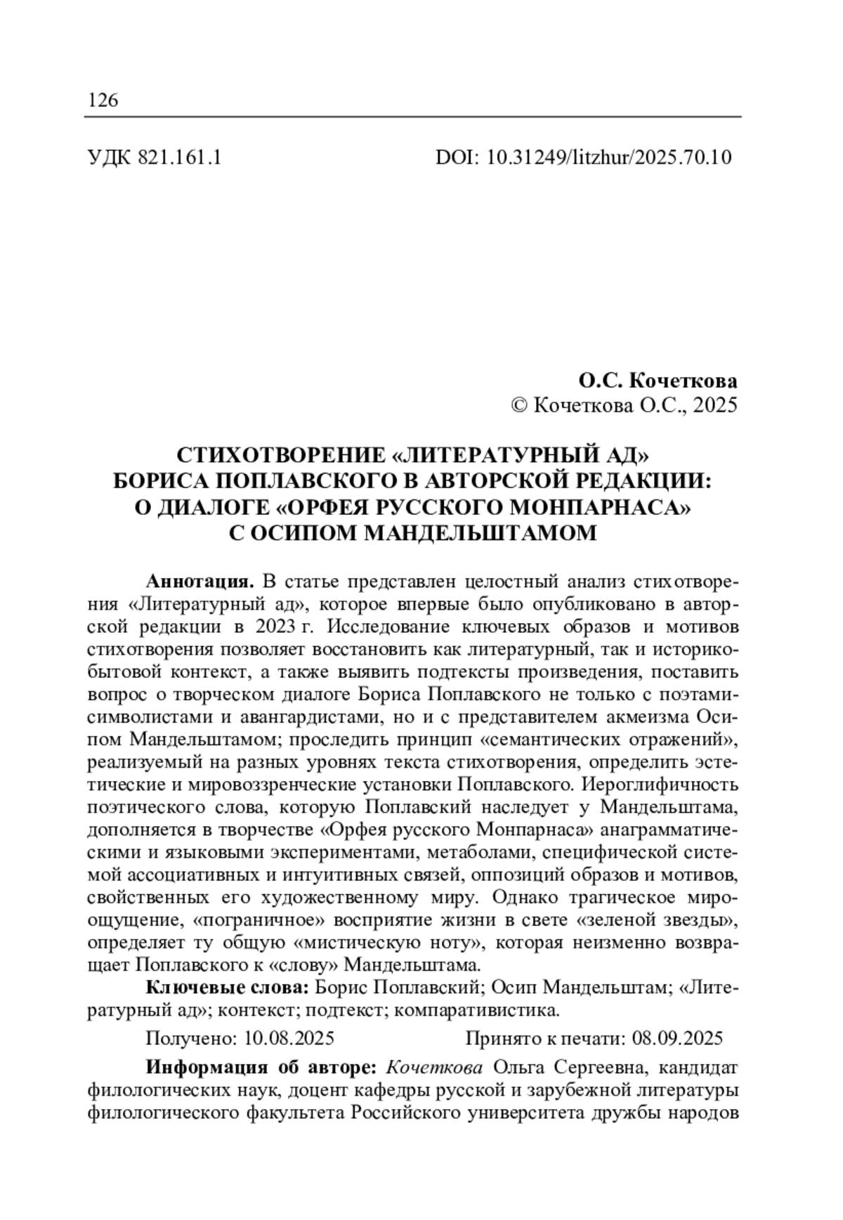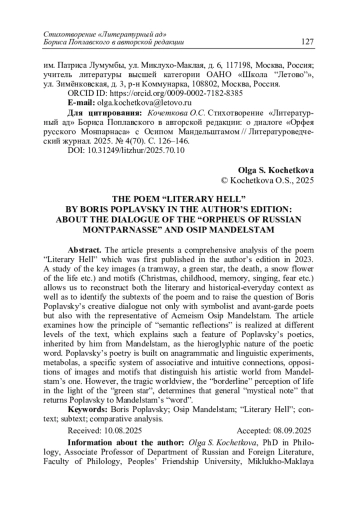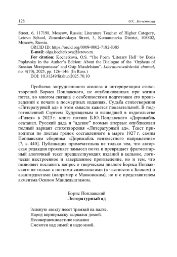 Кочеткова О.С. Стихотворение «Литературный ад» Бориса Поплавского в авторской редакции: о диалоге «Орфея русского Монпарнаса» с Осипом Мандельштамом // Литературоведческий журнал. 2025. No 4(70). С. 126‒146.