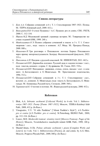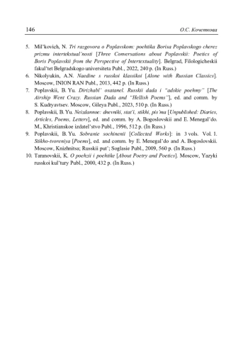 5. Mil’kovich, N. Tri razgovora o Poplavskom: poehtika Borisa Poplavskogo cherez prizmu intertekstual’nosti [Three Conversations about Poplavskii: Poetics of Boris Poplavskii from the Perspective of Intertextuality]. Belgrad, Filologicheskii fakul’tet Belgradskogo universiteta Publ., 2022, 240 p. (In Russ.)