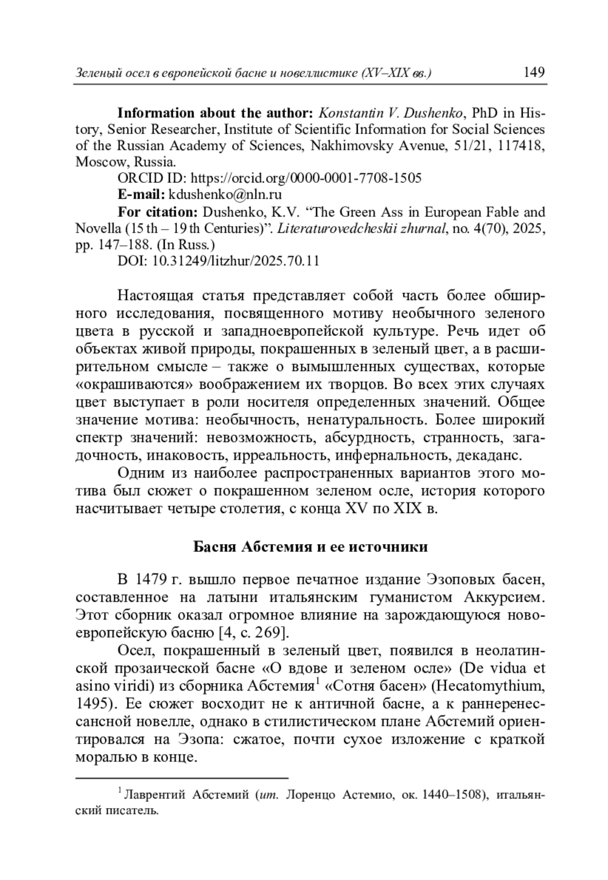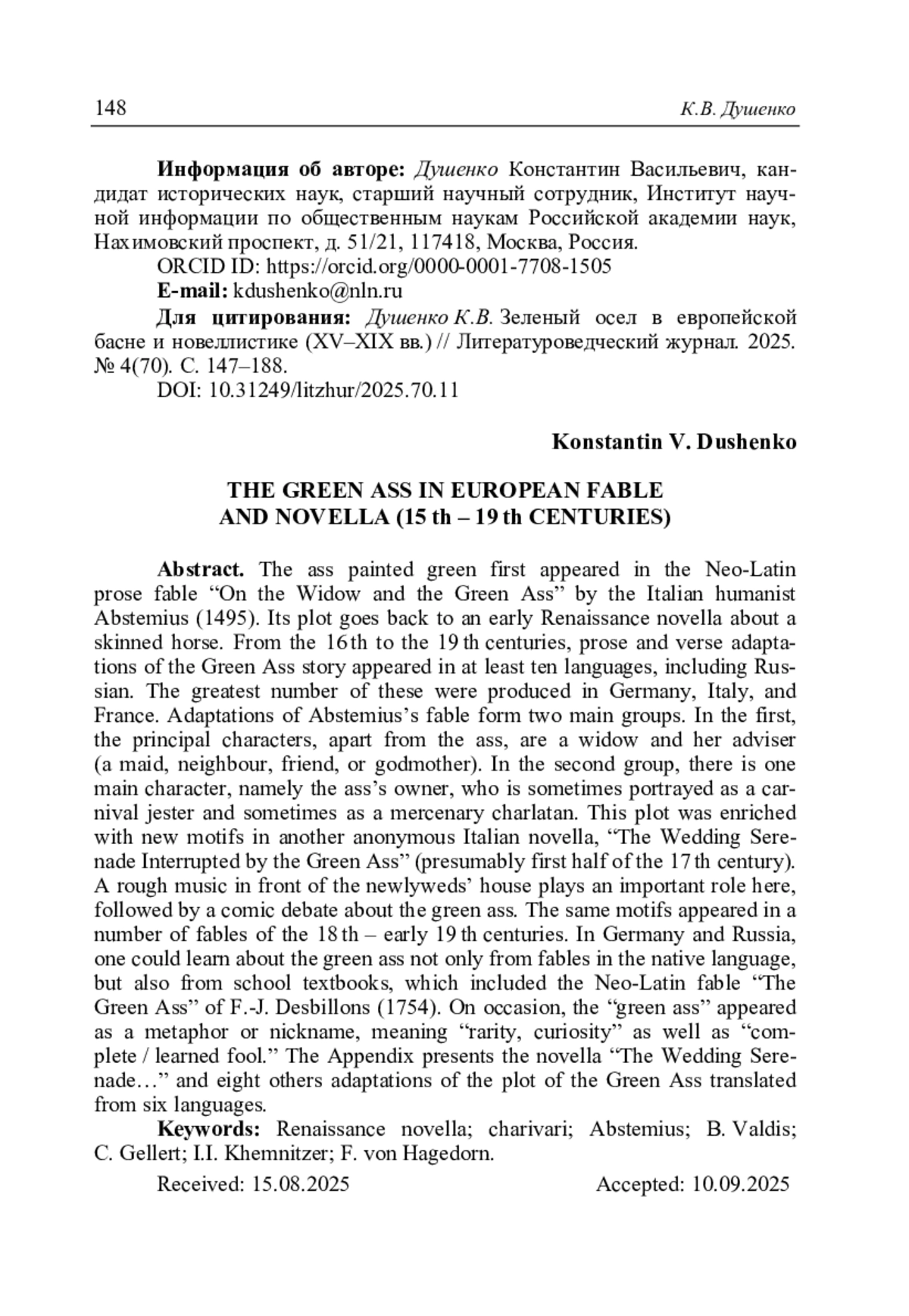 Душенко К.В. Зеленый осел в европейской басне и новеллистике (XV–XIX вв.) // Литературоведческий журнал. 2025. No 4(70). С. 147–188.