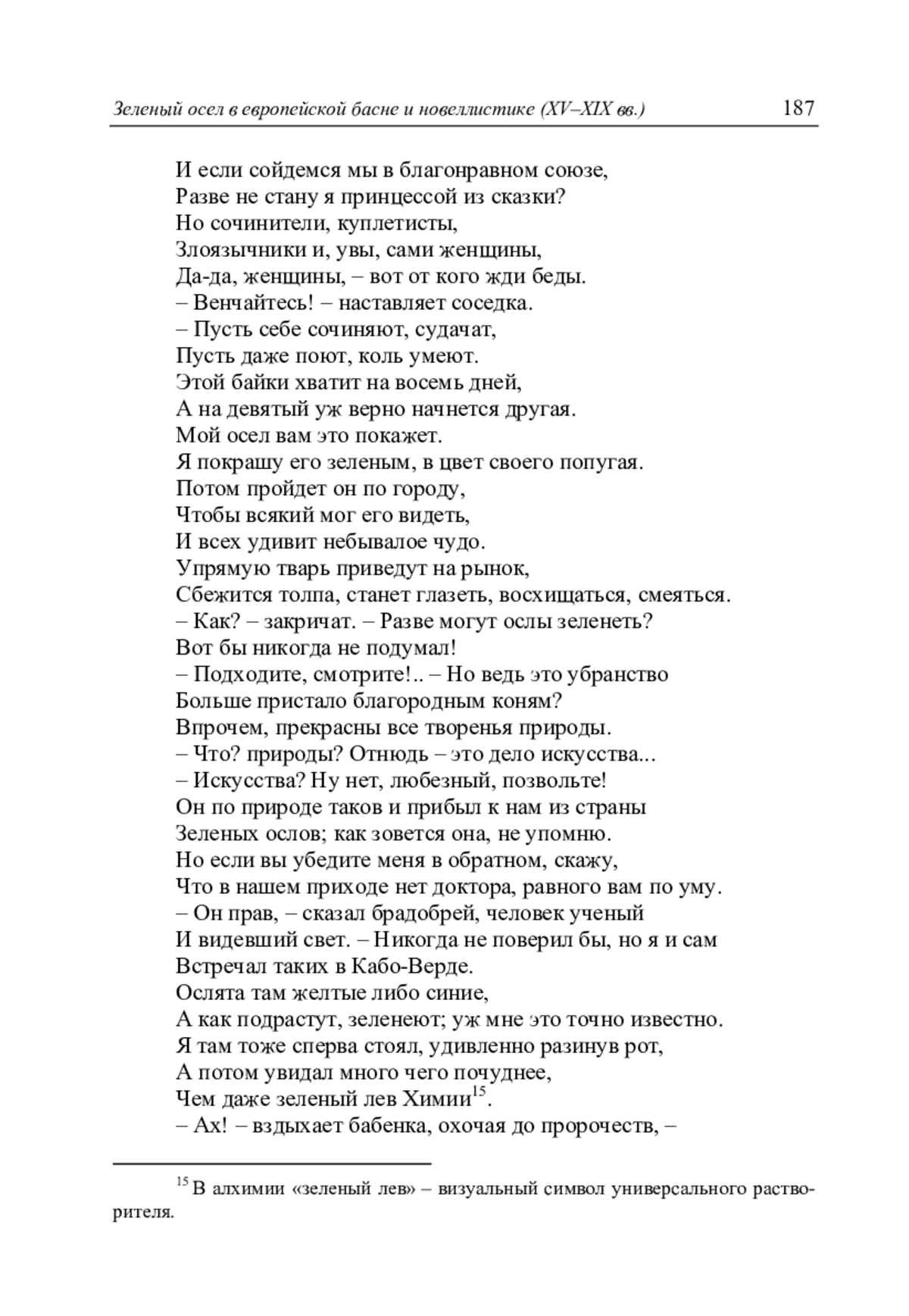 Осел, покрашенный в зеленый цвет, появился в неолатинской прозаической басне «О вдове и зеленом осле» итальянского гуманиста Абстемия (1495). Ее сюжет восходит к раннеренессансной новелле об ободранной лошади. В XVI-XIX вв. прозаические и стихотворные обработки сюжета о зеленом осле возникли не менее чем на десяти языках, включая русский. Больше всего их было создано в Германии, Италии и Франции. Переложения басни Абстемия составляют две основные группы. В первой главные персонажи, не считая осла, - вдова и ее советчица (служанка, соседка, подруга, кума). Во второй группе главный персонаж - хозяин осла; иногда он представлен карнавальным шутом, а иногда корыстным шарлатаном. Этот сюжет обогатился новыми мотивами в другой анонимной итальянской новелле: «Брачная серенада, прерванная зеленым ослом» (предположительно 1-я половина XVII в.). Важное место занимает здесь кошачий концерт перед домом новобрачных, а затем - комический диспут о зеленом осле. Те же мотивы появились в ряде басен XVIII - начала XIX в. В Германии и России о зеленом осле можно было узнать не только из басен на родном языке, но также из учебников латыни, куда включалась неолатинская басня Ф. Ж. Дебийона «Зеленый осел» (1754). Эпизодически «зеленый осел» встречался в роли метафоры или прозвища - в значении «редкость, диковина», а также «круглый / ученый дурак». В Приложении публикуется новелла «Брачная серенада…» и восемь других обработок сюжета о зеленом осле в переводе с шести языков.