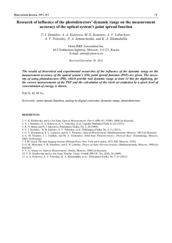 V. I. Demidov, A. A. Kolesova, M. E. Kononov, A. V. Lobachyov, A. V. Polesskiy, N. A. Semenchenko, and K. A. Khamidullin Re-search of influence of the photodetectors’ dynamic range on the measurement accuracy of the optical system’s point spread function 66