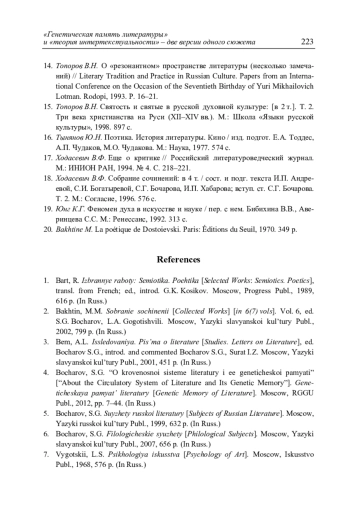14. Топоров В.Н. О “резонантном” пространстве литературы (несколько замечаний) // Literary Tradition and Practice in Russian Culture. Papers from an International Conference on the Occasion of the Seventieth Birthday of Yuri Mikhailovich Lotman. Rodopi, 1993. P. 16-21.