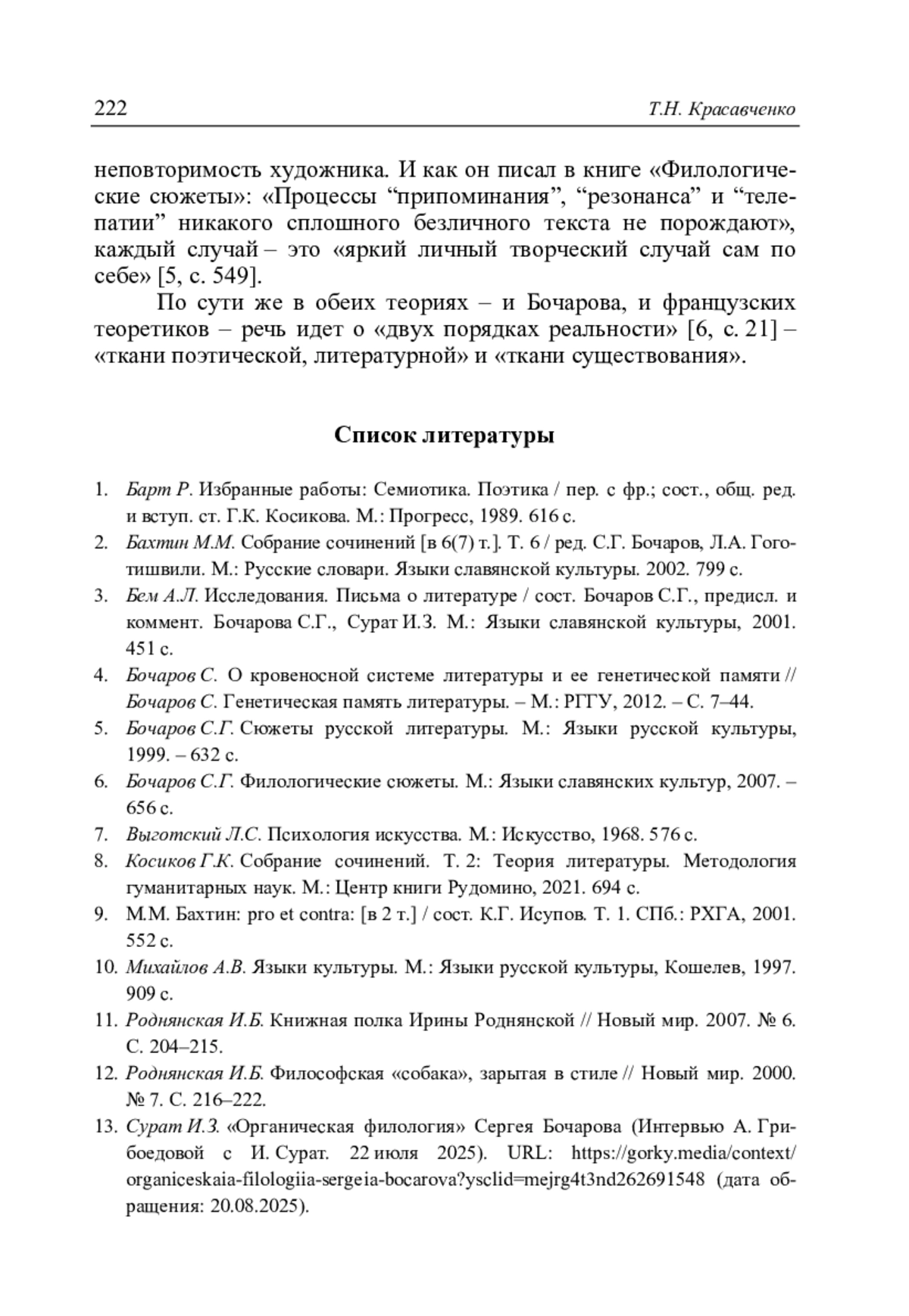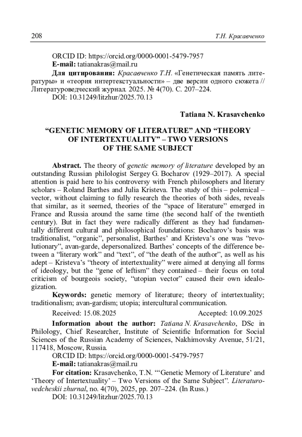 Красавченко Т.Н. «Генетическая память литературы» и «теория интертекстуальности» – две версии одного сюжета // Литературоведческий журнал. 2025. No 4(70). С. 207–224.