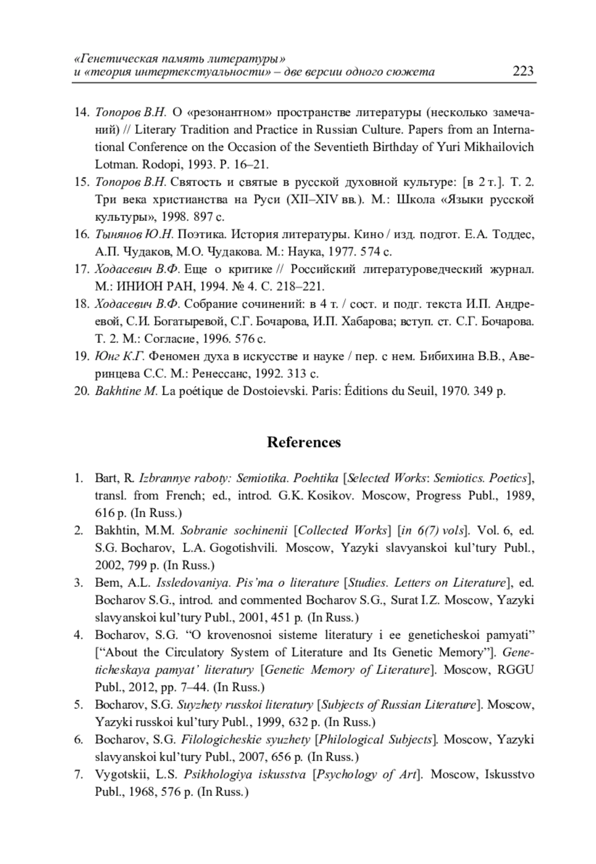 4. Bocharov, S.G. “O krovenosnoi sisteme literatury i ee geneticheskoi pamyati” [“About the Circulatory System of Literature and Its Genetic Memory”]. Geneticheskaya pamyat’ literatury [Genetic Memory of Literature]. Moscow, RGGU Publ., 2012, pp. 7–44. (In Russ.)