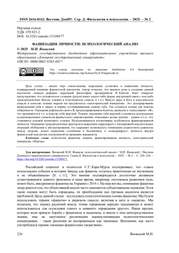 Цель статьи - анализ черт самосознания, моральных установок и мышления личности, подверженной влиянию фашистской идеологии. Автор полагает, что важную роль в создании данной идеологии сыграла реформа моральной философии, предпринятая И. Кантом. Кант отвергает представление, что человеческое сознание (разум) имеет какую-либо форму внутренней связи с чем-либо трансцендентным (Богом, идеями в платоновском смысле и т. п.). Вместо веры в Бога в классическом смысле в качестве основы морали им предлагается «категорический императив». Это декларирование принуждения себя к «вере» в нормы, устанавливаемые самому себе. Так создается основа для чувства избранности. Отрицание рефлексии своего Я, продекларированное Кантом, приводит к «капсуляции» «Я», что проявляется в т. ч. в чувстве себя жертвой. Ложное ощущение себя жертвой становится центральным псевдоморальным элементом фашистского мировоззрения, охватывает целые группы - нацию и т. п., что становится основой группового эгоизма. Недооцениваются когнитивные особенности фашизированной личности. Отрицание трансцендентных факторов в мышлении коррелирует с блокировкой мыслительных операций обобщения и абстрагирования, что закрывает возможность понимания сущностного равенства между людьми, делает мышление статичным и бессвязным, и «консервирует» личность внутри фашистской идеологии, построенной на принципе неравенств.