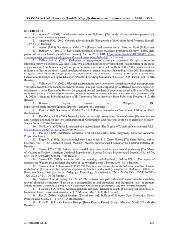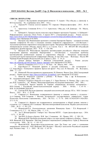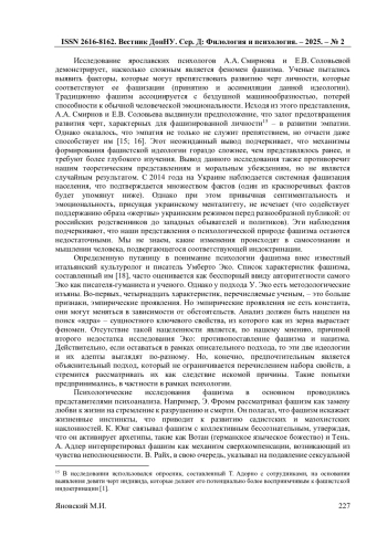 16. Смирнов А.А. Фашизм как подверженность антидемократии и общий уровень эмпатии у студентов / А.А. Смирнов, Е.В. Соловьева // Вестник интегративной психологии. Журнал для психологов. - 2020. - № 21. - С. 367-370.