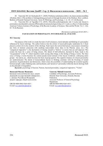 20. Яновский М.И. Проблема различения добра и зла через призму конфликта “Донбасс - Киев” / М.И. Яновский, К.В. Черкашин // Вестник Донецкого национального университета. Серия Д: Филология и психология. - 2020. - № 3-4. - С. 141-151. EDN: ZGRECA