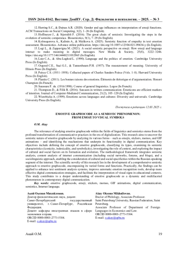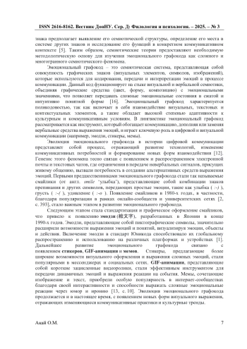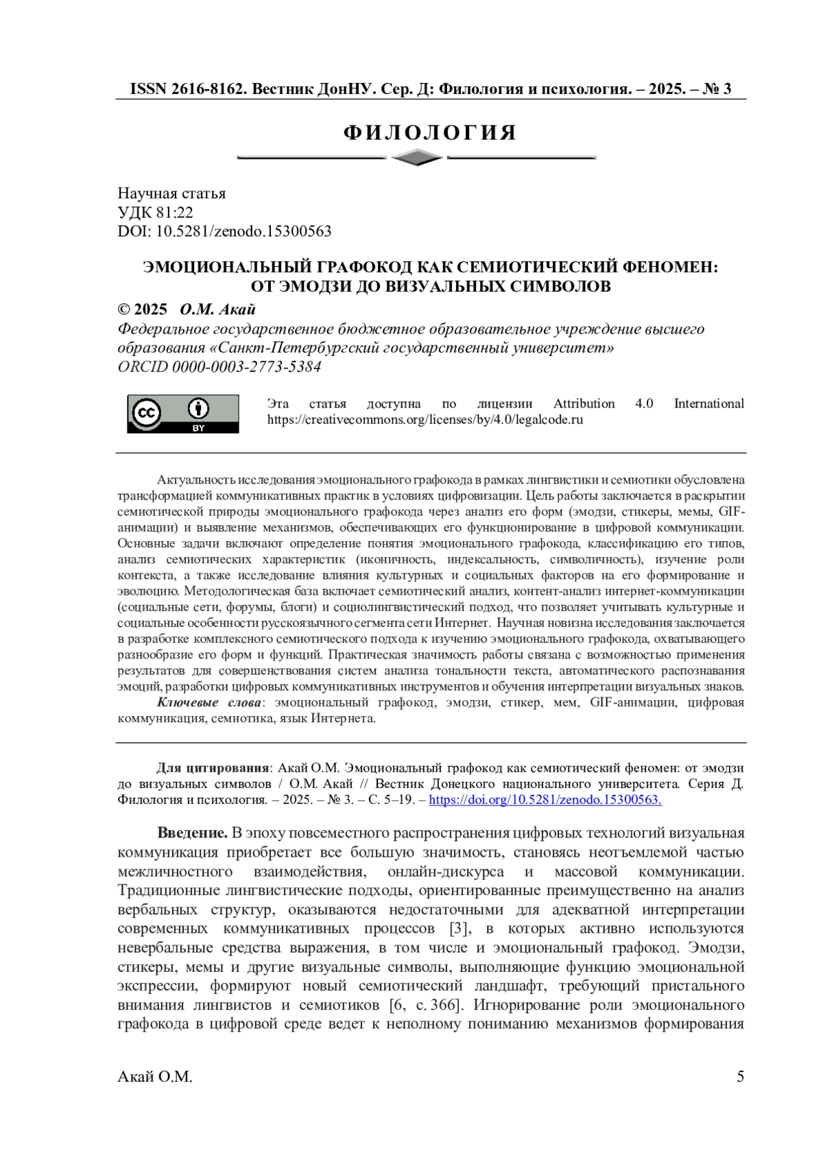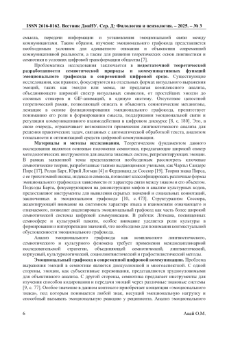Цель работы заключается в раскрытии семиотической природы эмоционального графокода через анализ его форм (эмодзи, стикеры, мемы, GIF- анимации) и выявление механизмов, обеспечивающих его функционирование в цифровой коммуникации.