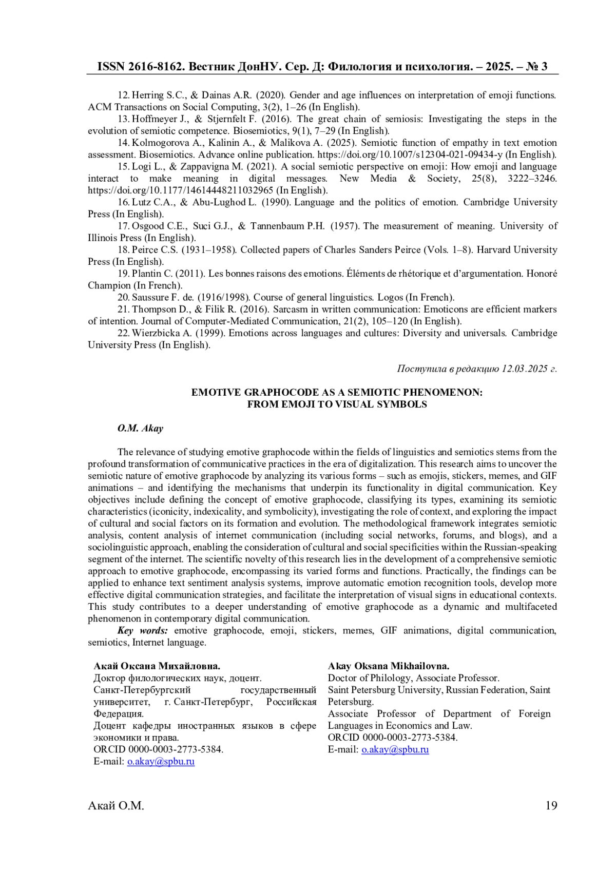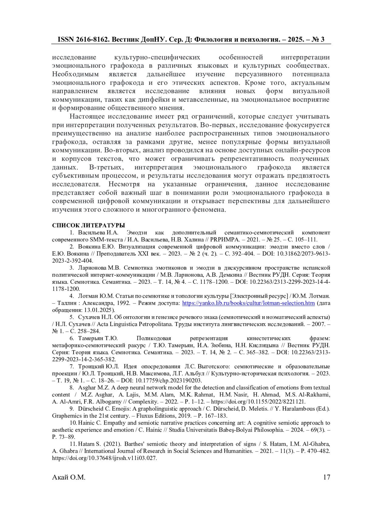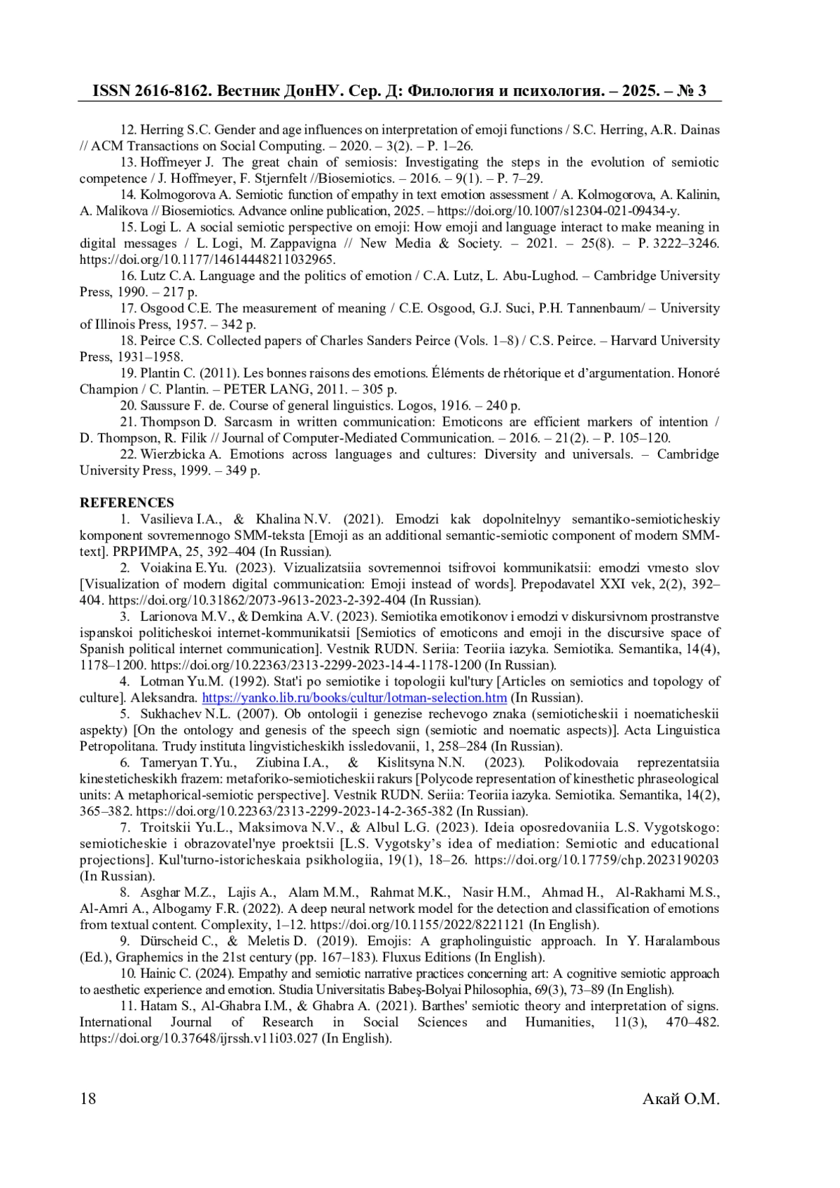 14. Kolmogorova A. Semiotic function of empathy in text emotion assessment / A. Kolmogorova, A. Kalinin, A. Malikova // Biosemiotics. Advance online publication, 2025. DOI: 10.1007/s12304-021-09434-y