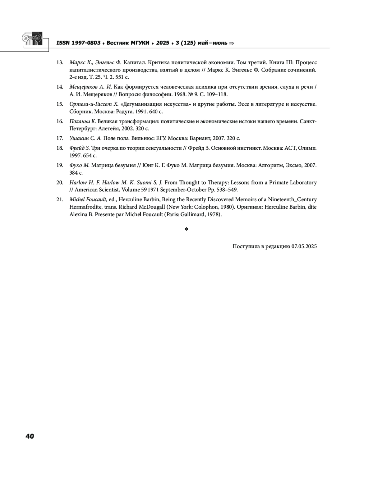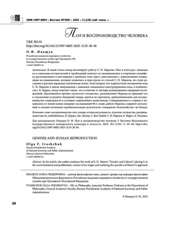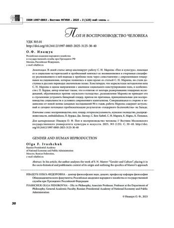 12. Мареев С. Н. Пол и культура // Вестник Московского государственного университета культуры и искусств, 2025, № 3 (125). С. 10-17. EDN: MHSVBQ