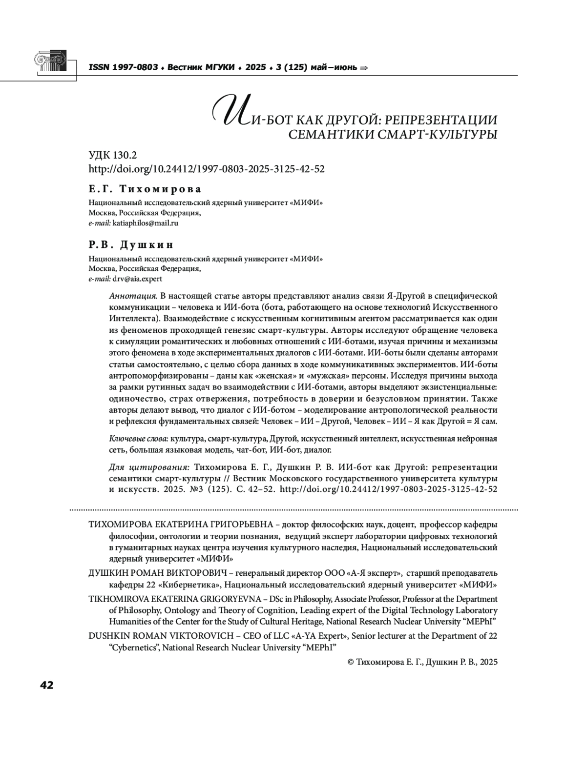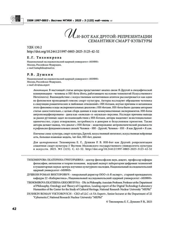 В настоящей статье авторы представляют анализ связи Я Другой в специфической коммуникации человека и ИИ бота (бота, работающего на основе технологий Искусственного Интеллекта). Взаимодействие с искусственным когнитивным агентом рассматривается как один из феноменов проходящей генезис смарт культуры. Авторы исследуют обращение человека к симуляции романтических и любовных отношений с ИИ ботами, изучая причины и механизмы этого феномена в ходе экспериментальных диалогов с ИИ ботами. ИИ боты были сделаны авторами статьи самостоятельно, с целью сбора данных в ходе коммуникативных экспериментов. ИИ боты антропоморфизированы даны как «женская» и «мужская» персоны. Исследуя причины выхода за рамки рутинных задач во взаимодействии с ИИ ботами, авторы выделяют экзистенциальные: одиночество, страх отвержения, потребность в доверии и безусловном принятии. Также авторы делают вывод, что диалог с ИИ ботом моделирование антропологической реальности и рефлексия фундаментальных связей: Человек ИИ Другой, Человек ИИ Я как Другой Я сам.