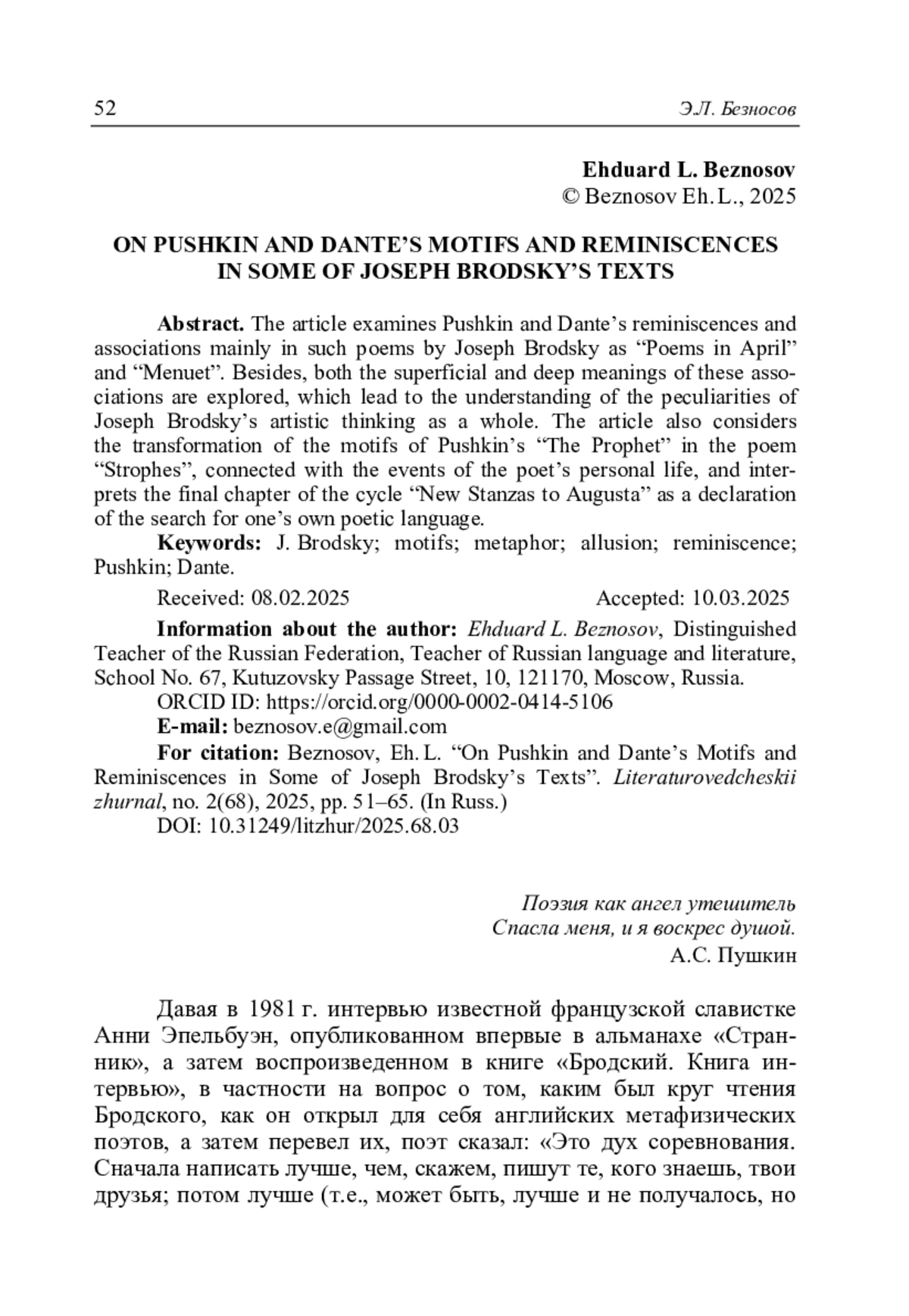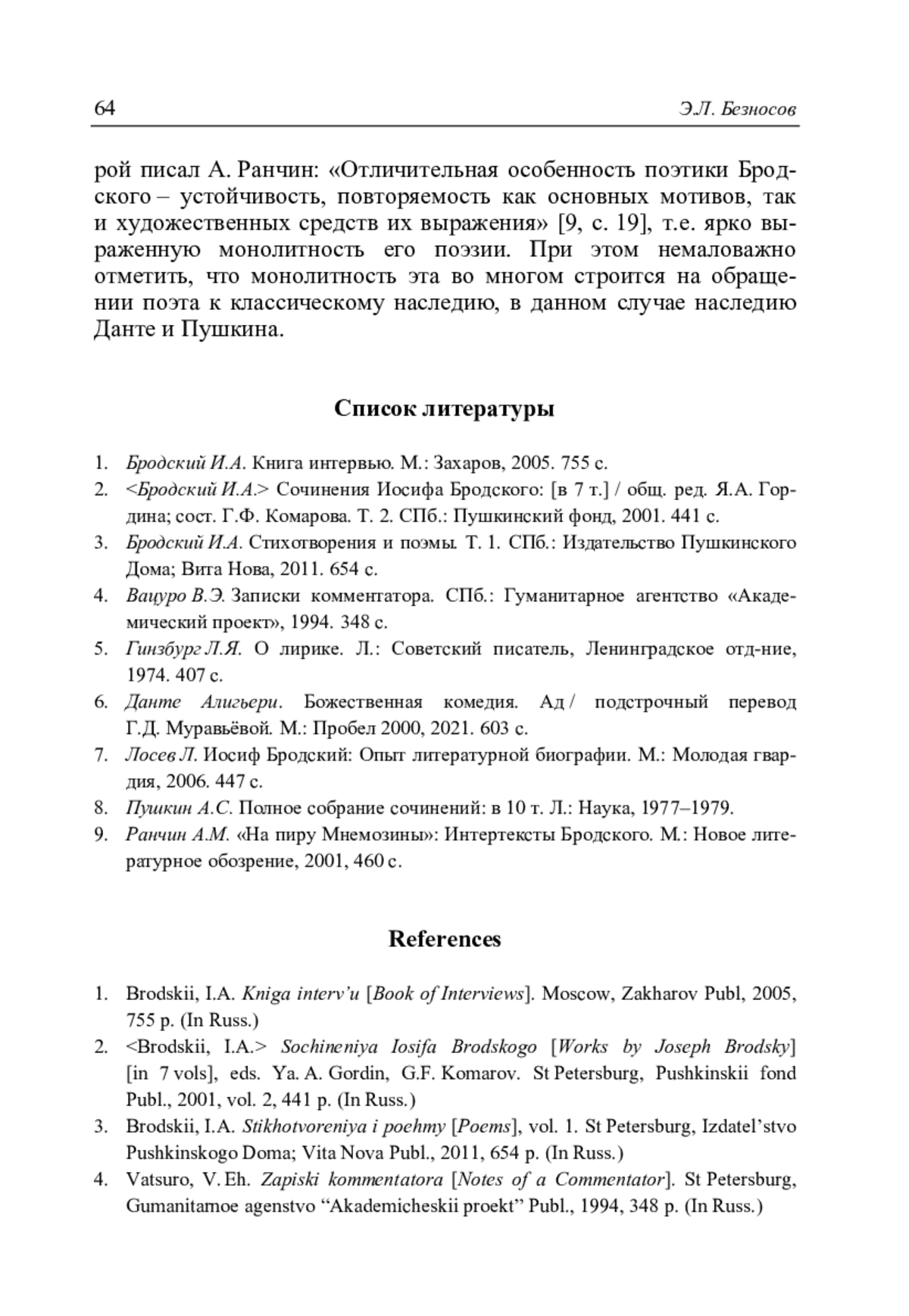 Безносов Э.Л. О пушкинских и дантовских мотивах и реминисценциях в некоторых текстах Иосифа Бродского // Литературоведческий журнал. 2025. No 2(68). С. 51–65.
