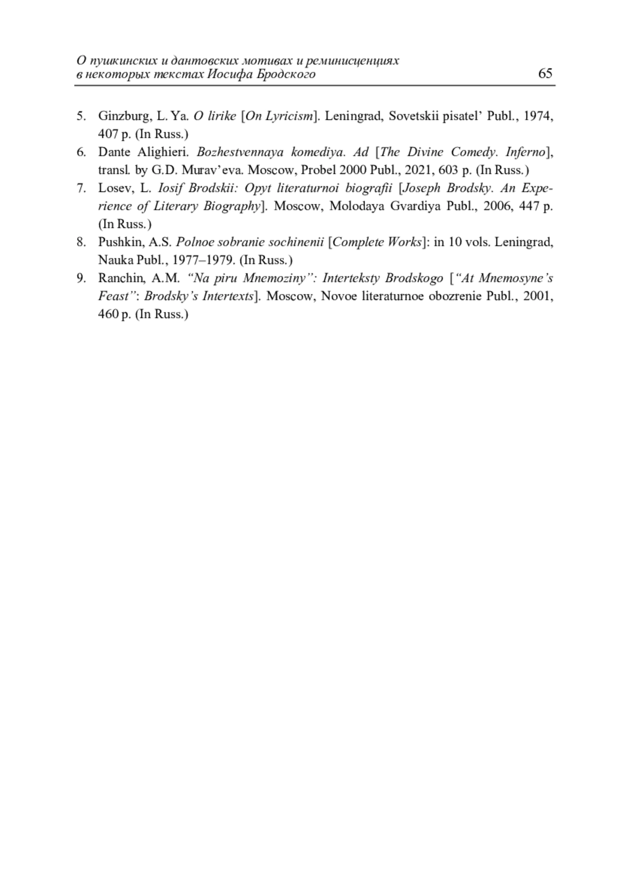 9. Ranchin, A.M. “Na piru Mnemoziny”: Interteksty Brodskogo [“At Mnemosyne’s Feast”: Brodsky’s Intertexts]. Moscow, Novoe literaturnoe obozrenie Publ., 2001, 460 p. (In Russ.)