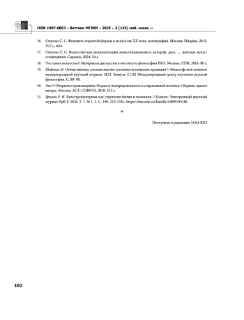 16. Ступин С. С. Феномен открытой формы в искусстве ХХ века: монография. Москва: Индрик, 2012. 312 с. EDN: QXCDOL