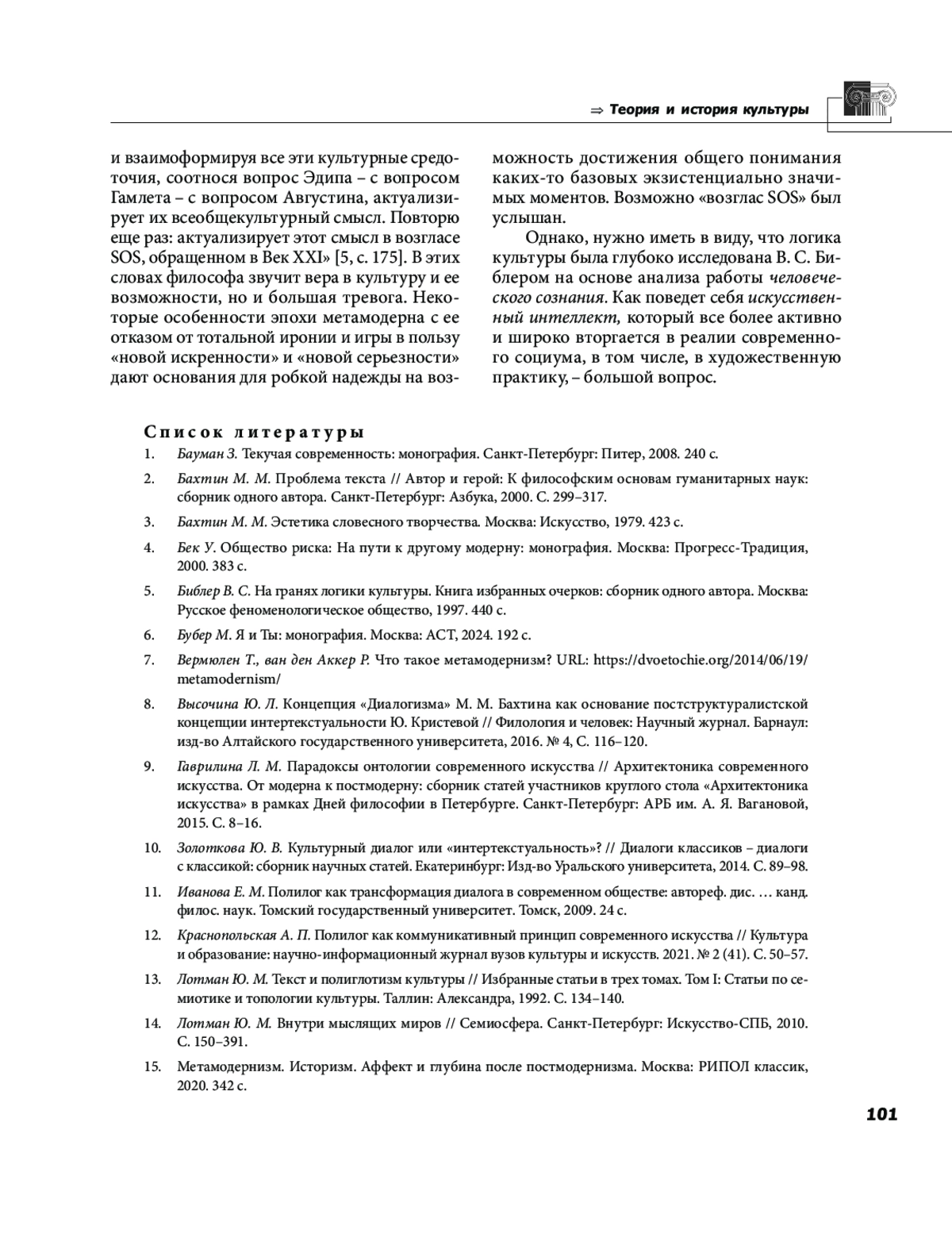12. Краснопольская А. П. Полилог как коммуникативный принцип современного искусства // Культура и образование: научно информационный журнал вузов культуры и искусств. 2021. № 2 (41). С. 50-57. EDN: TZMNXA