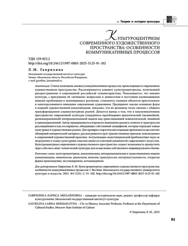 Статья посвящена анализу коммуникативных процессов, происходящих в современном художественном пространстве. Рассматривается концепт культуроцентризма, получивший распространение в современной российской гуманитаристике. Показывается, что именно культура, с присущими ей «вечными» вопросами и ценностями и постоянно возникающими новыми проблемами и меняющимися реалиями, становится главным объектом пристального и заинтересованного внимания современных художников. Предпринят анализ основных форм и моделей художественной коммуникации, показано, что их динамика тесно связана с общими трансформациями социокультурных реалий. Делается вывод о том, что в коммуникативном пространстве современной культуры утвердилось преобладание диалогической (нелинейной, разнонаправленной) интеракциональной модели над трансляционной монологической, линейной и однонаправленной. Автор придерживается широкого понимания диалога; полилог и трансгрессия рассматриваются как его варианты, обладающие собственной спецификой, которые отражают новые культурные и художественные реалии. Для проверки теоретических подходов привлекается достаточно обширный эмпирический материал, рассматривается круг художественных приемов, используемых в современной художественной практике. Актуализация экзистенциальной проблематики через ее погружение в толщу культурных смыслов является сквозной доминантой современного искусства. Культуроцентризм современного художественного пространства создает возможность пропустить через себя весь опыт человеческой культуры для осмысления собственного индивидуального бытия.