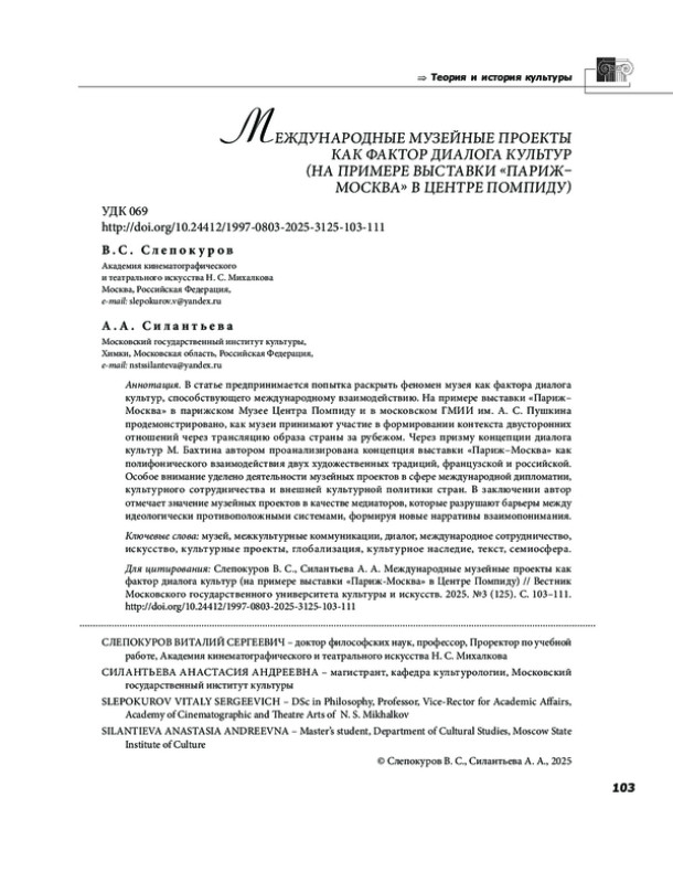 В статье предпринимается попытка раскрыть феномен музея как фактора диалога культур, способствующего международному взаимодействию. На примере выставки «Париж-Москва» в парижском Музее Центра Помпиду и в московском ГМИИ им. А. С. Пушкина продемонстрировано, как музеи принимают участие в формировании контекста двусторонних отношений через трансляцию образа страны за рубежом. Через призму концепции диалога культур М. Бахтина автором проанализирована концепция выставки «Париж Москва» как полифонического взаимодействия двух художественных традиций, французской и российской. Особое внимание уделено деятельности музейных проектов в сфере международной дипломатии, культурного сотрудничества и внешней культурной политики стран. В заключении автор отмечает значение музейных проектов в качестве медиаторов, которые разрушают барьеры между идеологически противоположными системами, формируя новые нарративы взаимопонимания.