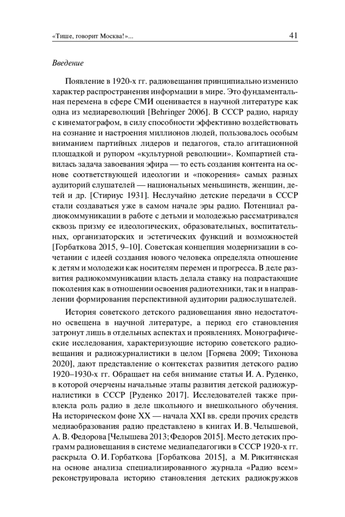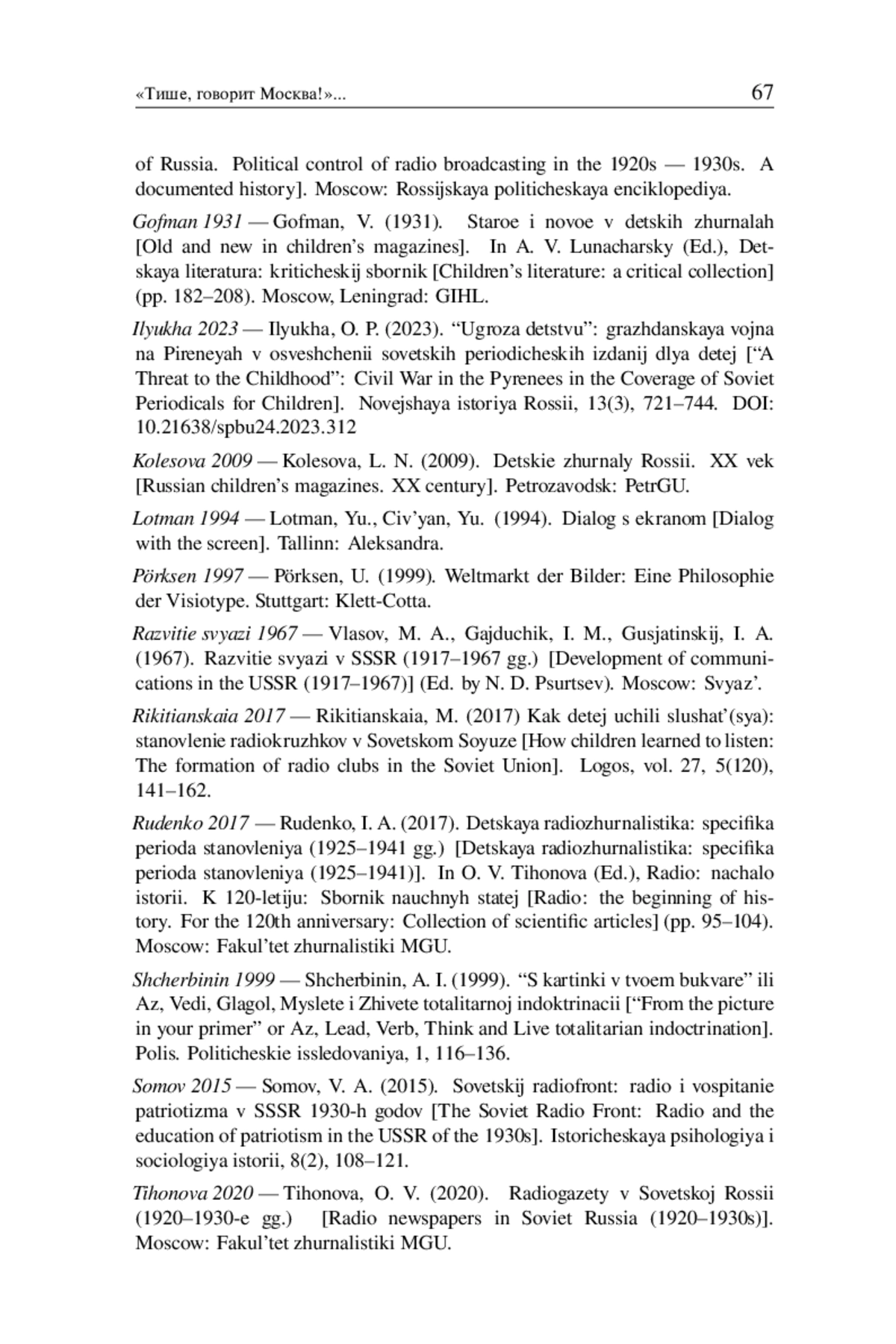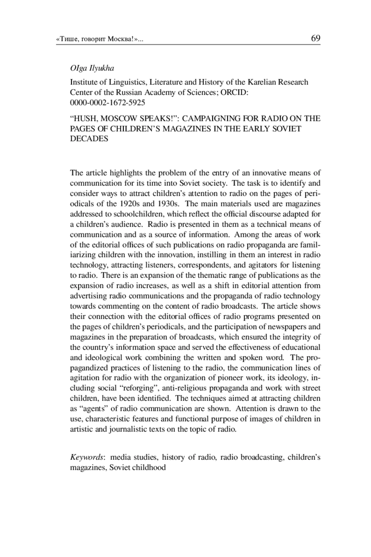 The article highlights the problem of the entry of an innovative means of communication for its time into Soviet society. The task is to identify and consider ways to attract children’s attention to radio on the pages of periodicals of the 1920s and 1930s. The main materials used are magazines addressed to schoolchildren, which reflect the official discourse adapted for a children’s audience. Radio is presented in them as a technical means of communication and as a source of information. Among the areas of work of the editorial offices of such publications on radio propaganda are familiarizing children with the innovation, instilling in them an interest in radio technology, attracting listeners, correspondents, and agitators for listening to radio. There is an expansion of the thematic range of publications as the expansion of radio increases, as well as a shift in editorial attention from advertising radio communications and the propaganda of radio technology towards commenting on the content of radio broadcasts. The article shows their connection with the editorial offices of radio programs presented on the pages of children’s periodicals, and the participation of newspapers and magazines in the preparation of broadcasts, which ensured the integrity of the country’s information space and served the effectiveness of educational and ideological work combining the written and spoken word. The propagandized practices of listening to the radio, the communication lines of agitation for radio with the organization of pioneer work, its ideology, including social “reforging”, antireligious propaganda and work with street children, have been identified. The techniques aimed at attracting children as “agents” of radio communication are shown. Attention is drawn to the use, characteristic features and functional purpose of images of children in artistic and journalistic texts on the topic of radio.