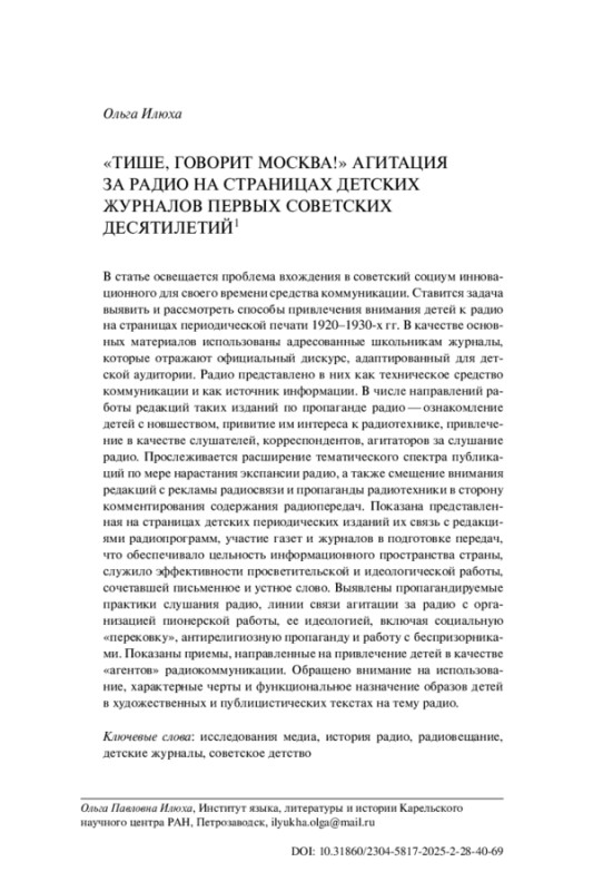 В статье освещается проблема вхождения в советский социум инновационного для своего времени средства коммуникации. Ставится задача выявить и рассмотреть способы привлечения внимания детей к радио на страницах периодической печати 1920-1930-х гг. В качестве основных материалов использованы адресованные школьникам журналы, которые отражают официальный дискурс, адаптированный для детской аудитории. Радио представлено в них как техническое средство коммуникации и как источник информации. В числе направлений работы редакций таких изданий по пропаганде радио - ознакомление детей с новшеством, привитие им интереса к радиотехнике, привлечение в качестве слушателей, корреспондентов, агитаторов за слушание радио. Прослеживается расширение тематического спектра публикаций по мере нарастания экспансии радио, а также смещение внимания редакций с рекламы радиосвязи и пропаганды радиотехники в сторону комментирования содержания радиопередач. Показана представленная на страницах детских периодических изданий их связь с редакциями радиопрограмм, участие газет и журналов в подготовке передач, что обеспечивало цельность информационного пространства страны, служило эффективности просветительской и идеологической работы, сочетавшей письменное и устное слово. Выявлены пропагандируемые практики слушания радио, линии связи агитации за радио с организацией пионерской работы, ее идеологией, включая социальную «перековку», антирелигиозную пропаганду и работу с беспризорниками. Показаны приемы, направленные на привлечение детей в качестве «агентов» радиокоммуникации. Обращено внимание на использование, характерные черты и функциональное назначение образов детей в художественных и публицистических текстах на тему радио.