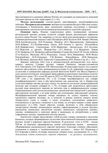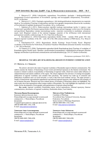 Статья посвящена изучению региональной лексики Камчатского края в интернет-коммуникации. Авторы рассматривают особенности функционирования местных слов и неофициальных топонимов в Интернет-среде. Проблематика исследования связана с анализом особенностей функционирования региональных слов, возникших под влиянием культурно-исторических и природных условий региона. В статье подчеркивается актуальность создания лексикографических изданий региональной лексики и рассматривается их специфика. Материалом послужили комментарии и публикации пользователей платформ в социальных сетях, а также данные из опросов местных жителей. В работе представлена выборка характерных регионализмов-апеллятивов и неофициальных региональных топонимов, их определения и примеры использования в Интернет-дискурсе. Освещены исторические и социокультурные факторы формирования камчатского наречия. Основные результаты показывают, что регионализмы отражают уникальные реалии Камчатки. Работа подчеркивает значимость таких исследований для развития лексикографии и популяризации регионального культурного наследия.