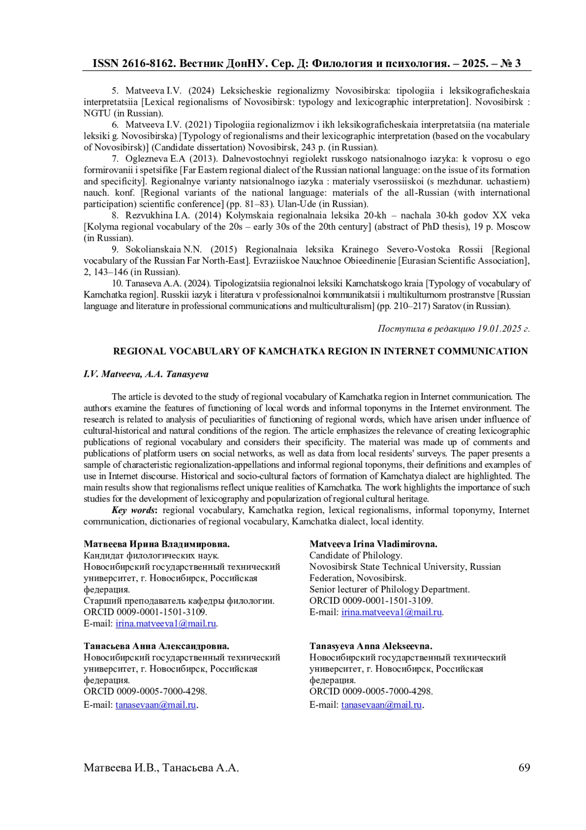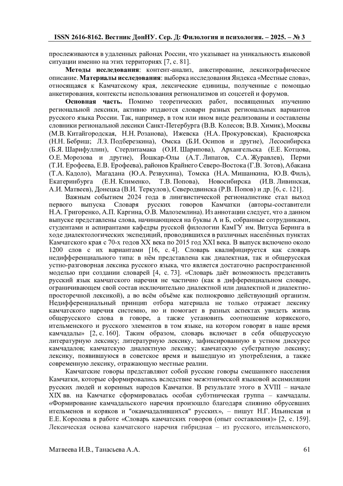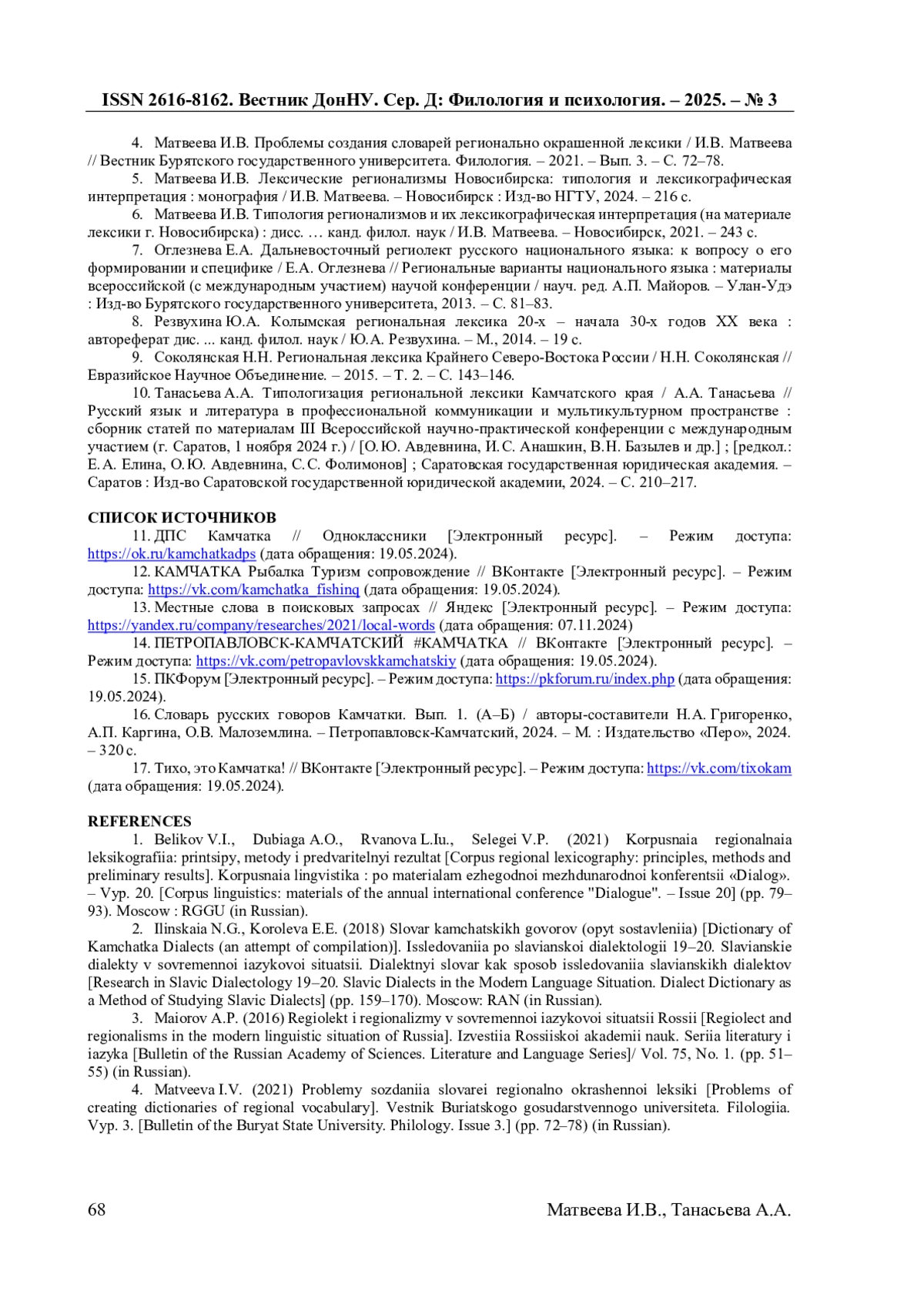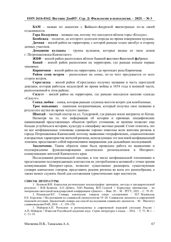 10. Танасьева А.А. Типологизация региональной лексики Камчатского края / А.А. Танасьева // Русский язык и литература в профессиональной коммуникации и мультикультурном пространстве: сборник статей по материалам III Всероссийской научно-практической конференции с международным участием (г. Саратов, 1 ноября 2024 г.) / [О. Ю. Авдевнина, И. С. Анашкин, В. Н. Базылев и др.]; [редкол.: Е. А. Елина, О. Ю. Авдевнина, С. С. Фолимонов]; Саратовская государственная юридическая академия. - Саратов: Изд-во Саратовской государственной юридической академии, 2024. - С. 210-217. EDN: CJSJRH