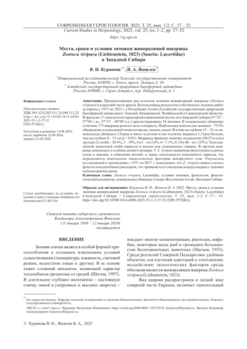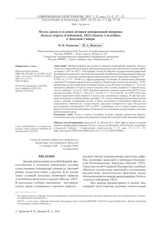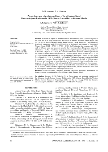 40. Эпова Л. А., Куранова В. Н., Ярцев В. В. 2020. Особенности размножения живородящей ящерицы Zootoca vivipara (Lichtenstein, 1823) (Sauria, Lacertidae) различных высотных поясов Кузнецкого Алатау // Вестник Томского государственного университета. Биология. № 50. С. 79 - 100. DOI: 10.17223/19988591/50/4