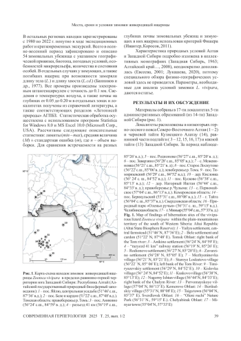 Проанализирован ряд аспектов зимовки живородящей ящерицы (Zootoca vivipara) в азиатской части ареала. Использованы результаты собственных полевых работ за период с 1971 по 2022 г. в Республике Алтай (Алтайский государственный природный биосферный заповедник), Томской, Кемеровской, Челябинской и Свердловской областях. В пределах 17 локалитетов предгорной и равнинной частях юга Западной Сибири (51°22’ - 57°04’ с. ш., 57°33’ - 88°08’ в. д.) зарегистрированы 54 зимовки. В зимовальных убежищах отмечено 173 ящерицы разного пола и возраста. Наибольшее количество зимовок - 75.9% обнаружено в агрогенной почве (огороды, пашни, сады). В почве на глубине 15 - 25 см зимовальных убежищ в 2.8 раза и число залегших в них в спячку ящериц в 1.5 раза больше, чем на глубине 0 - 15 см (p < 0.01). Ящерицы проводят зимовку поодиночке (44.2%) или в группах (2 особи - 20.4%, 3 - 19%, 4 и 5 - по 5.6%, 6 - 7.1%, 9, 14 и 40 - по 1.85%). Тело одиночной зимующей особи свернуто в кольцо или уплощенную спираль. В группах ящерицы находились в клубках разного размера. У Z. vivipara выявлены флуктуации в сроках ухода в зимовку и появления весной, а также длительности неактивного периода, что определяется комплексом экологических факторов конкретного года. Результаты исследований в заповеднике с 1971 по 2017 г. показывают, что Z. vivipara можно считать фенологическим биоиндикатором, что проявляется в смещении выхода ящериц с зимовки на более ранние сроки.