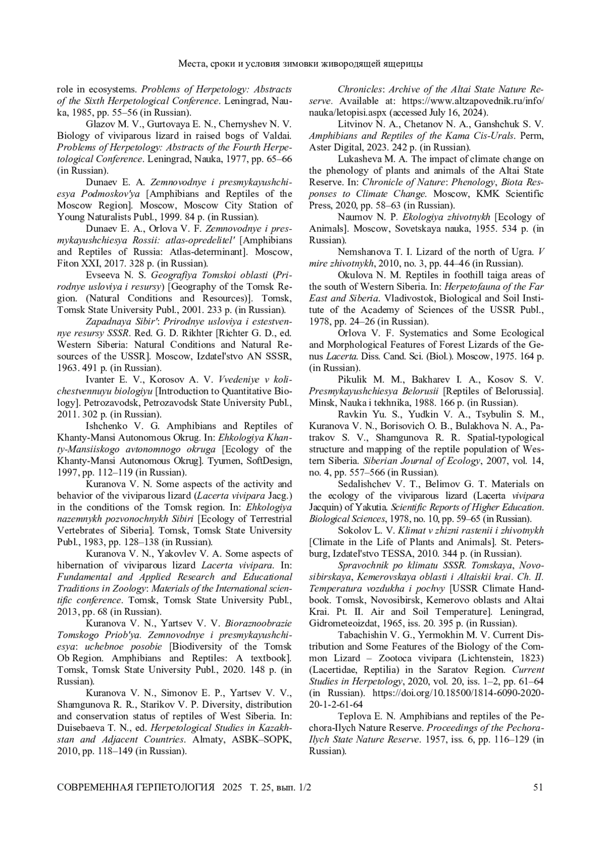 21. Куранова В. Н., Симонов Е. П., Ярцев В. В., Шамгунова Р. Р., Стариков В. П. 2010. Разнообразие, распространение и природоохранный статус пресмкающихся Западной Сибири // Герпетологические исследования в Казахстане и сопредельных странах / под ред. Т. Н. Дуйсебаевой. Алматы: АСБК; СОПК. С. 118 - 149.