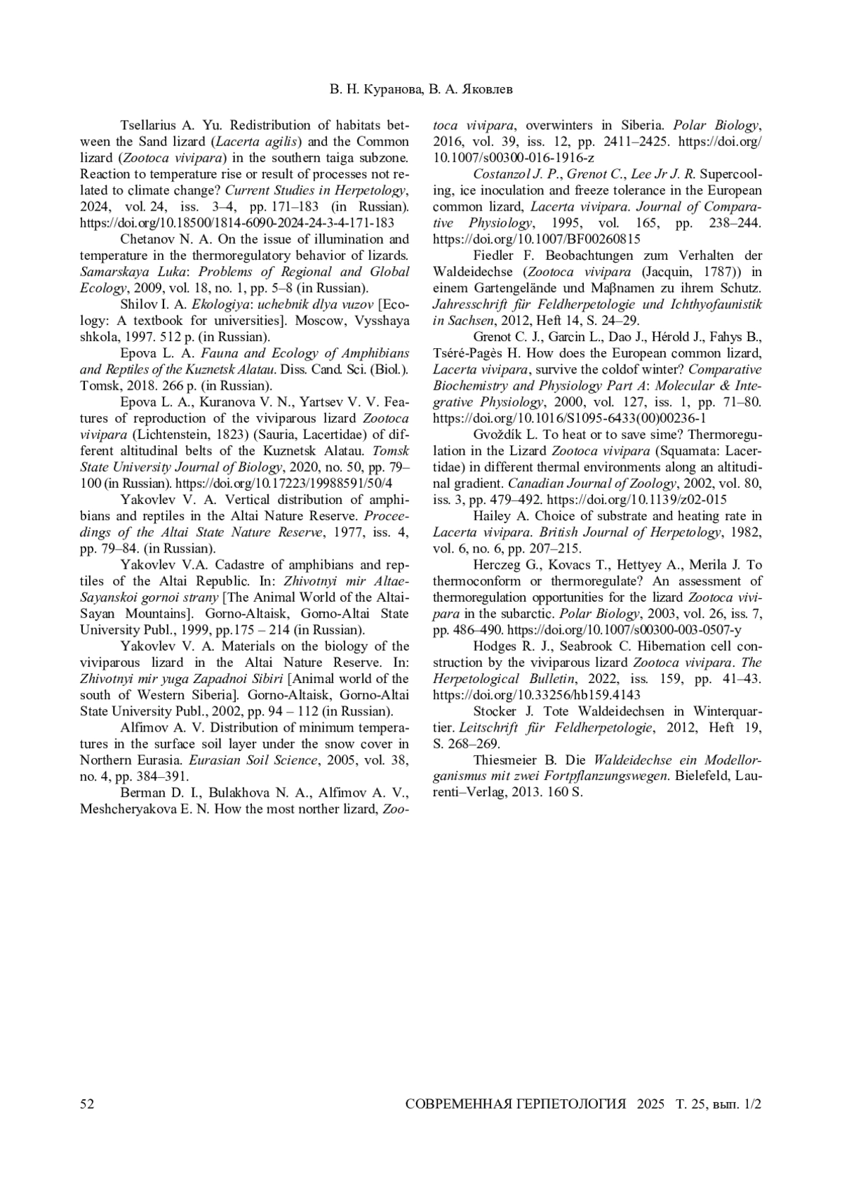45. Berman D. I., Bulakhova N. A., Alfimov A. V., Meshcheryakova E. N. 2016. How the most norther lizard, Zootoca vivipara, overwinters in Siberia // Polar Biology. Vol. 39, iss. 12. P. 2411 - 2425. DOI: 10.1007/s00300-016-1916-z