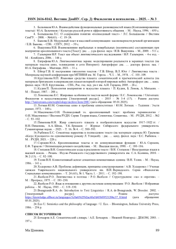 8. Евграфова Ю.А. Лингвосемиотика экрана: моделирование реальности в экранных текстах (на материале текстов кино, телевидения и сети Интернет): Автореферат дис. … доктора филол. нак. / Ю.А. Евграфова. - Мытищи, 2021. - 31 с. EDN: ODFTLJ