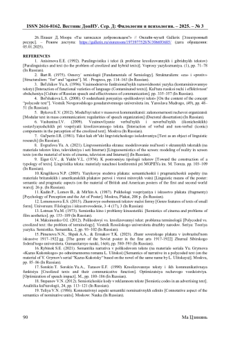 1. Анисимова Е.Е. Паралингвистика и текст (к проблеме креолизованных и гибридных текстов) / Е.Е. Анисимова // Вопросы языкознания, 1992. - №1. - С. 71-78. EDN: YWDJRV