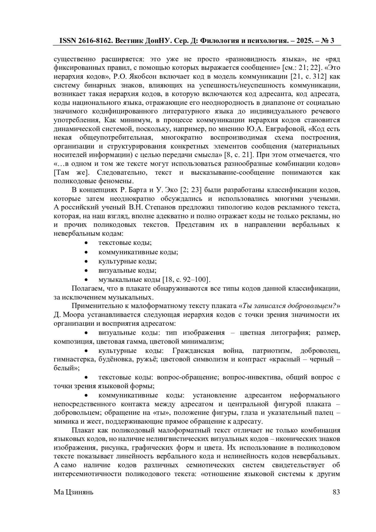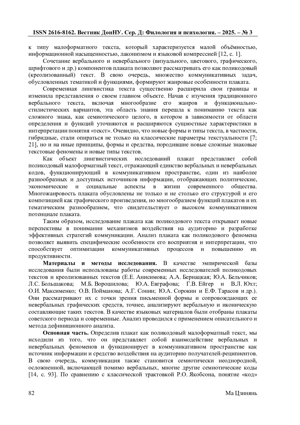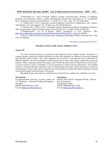 В статье рассматривается плакат как поликодовый малоформатный текст с модульной структурой. Плакат представляет собой сложную динамическую систему, включающую иерархии кодов адресанта, адресата, национального языка и индивидуальные речевые особенности. В результатах подчёркивается, что плакат характеризуется комбинированием различных языковых кодов и нелингвистических визуальных элементов, таких как иконические знаки, изображения, графические формы и цветовые решения. Эти компоненты усиливают воздействие вербального кода и повышают выразительность плаката. Особое внимание уделяется модульности как ключевому параметру поликодовости плаката. Модульная структура выражается через композицию, использование фона и рамок, а также взаимодействие визуальных и вербальных элементов. Границы рамки играют важную роль в модульных невербальных и вербальных компонентов, обеспечивая структурную целостность и функциональность плаката.