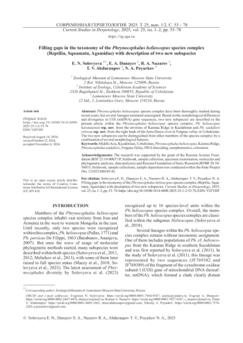 24. Solovyeva E. N., Dunayev Е. А. Poyarkov N. А. Subspecies systematics of the species complex of sunwatchet toad-headed agama (Phrynocephalus helioscopus (Pallas 1771)) (Squamata, Agamidae). Zoologicheskiy zhurnal, 2012, vol. 91, no. 11, pp. 1-20 (in Russian).