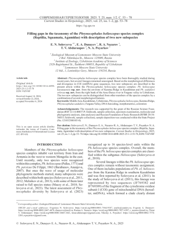 В последние годы комплекс видов Phrynocephalus helioscopus был тщательно изучен, но некоторые его представители так и не были классифицированы. На основании морфологических различий и расхождений в последовательностях гена COI (митохондриальной ДНК) в данной статье описаны два новых подвида в составе комплекса видов Phrynocephalus helioscopus: Ph. helioscopus karatauensis ssp. nov. из окрестностей хребта Каратау в Казахстане и Ph. saidalievi orlovae ssp. nov. с правого берега Амударьи в Ферганской долине в Узбекистане. Два новых подвида можно отличить от других представителей видового комплекса по сочетанию нескольких морфологических признаков.