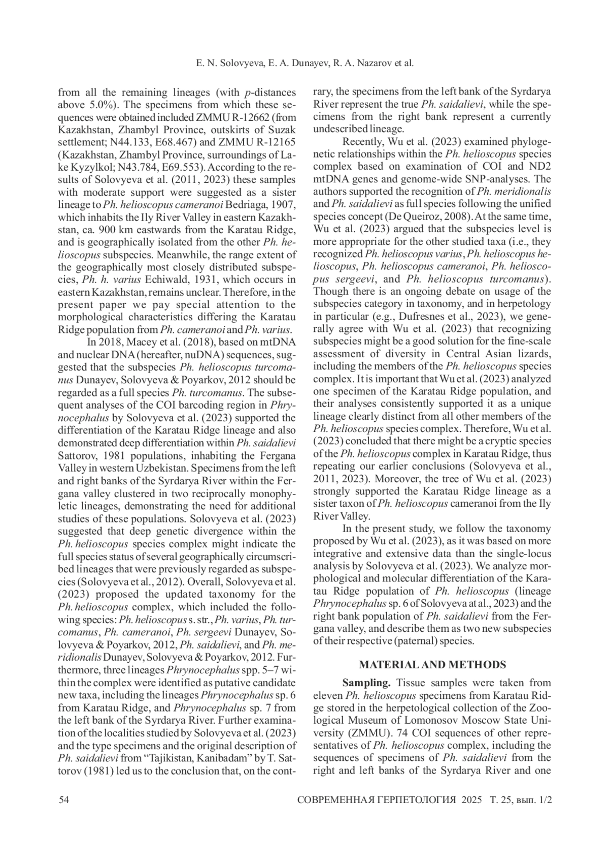 Members of the species complex inhabit vast territory from Iran and Armenia in the west to western Mongolia in the east. Until recently, only two species were recognized within this complex, (Pallas, 1771) and Phrynocephalus helioscopus Ph. helioscopus Ph. persicus De Filippi, 1863 (Barabanov, Ananjeva, 2007). But once the wave of usage of molecular phylogenetic methods started, many subspecies were described within both species (Solovyeva et al., 2011, 2012; Melnikov et al., 2013), with some of them later raised to full species status (Macey et al., 2018; Solovyeva et al., 2023). The latest assessment of Phrynocephalus diversity by Solovyeva et al. (2023) recognized up to 16 species-level units within the Ph. helioscopus species complex. Overall, the members of the species complex are classified within the subgenus (Solovyeva et al. 2018).
