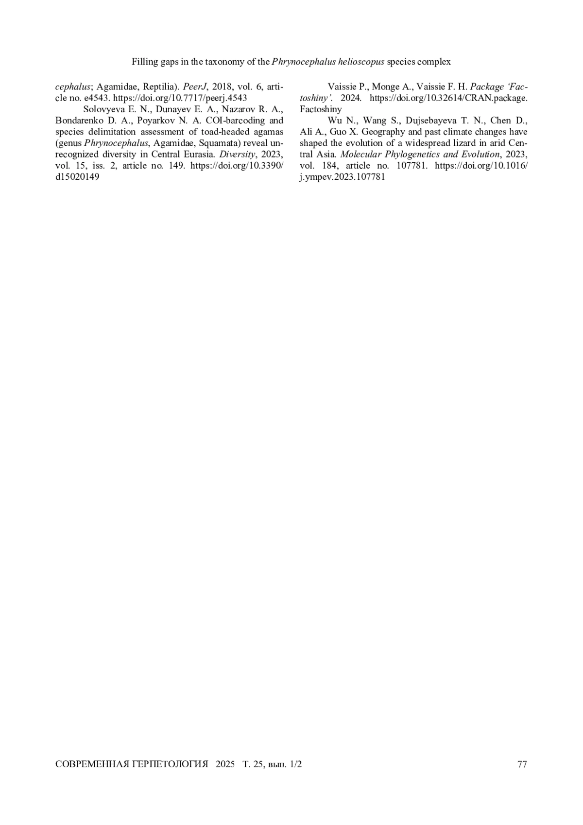 23. Соловьева Е. Н., Поярков Н. А., Дунаев Е. А., Дуйсебаева Т. Н., Банникова А. А. Молекулярная дифференциация и систематика надвидового комплекса солнечников Phrynocephalus helioscopus (Pallas 1771) (Reptilia: Agamidae). Генетика, 2011, т. 7, с. 952–967.
