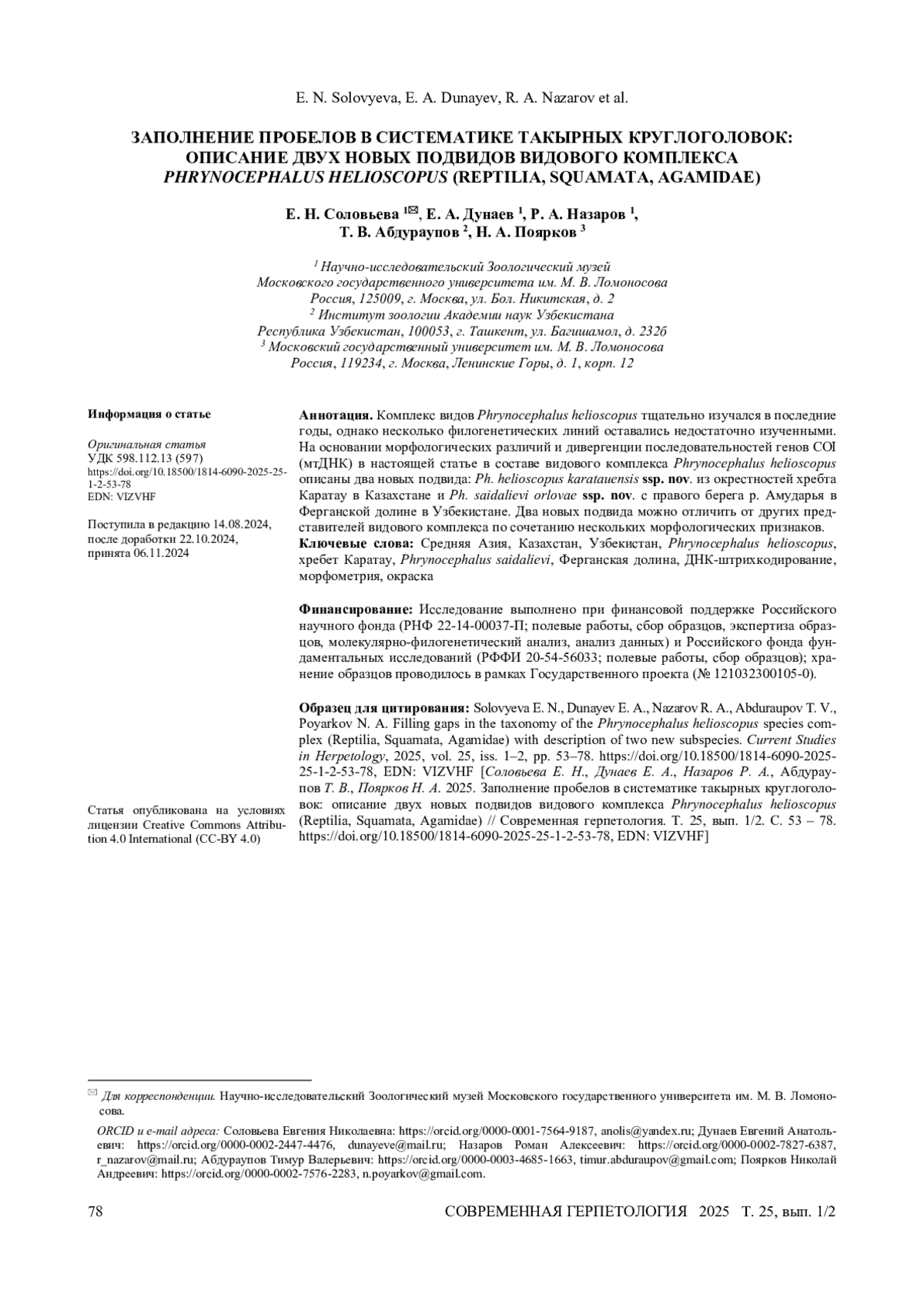 25. Соловьева Е. Н., Лебедев В. С., Дунаев Е. А., Назаров Р. А., Банникова А. А., Че Дж., Мерфи Р. У., Поярков Н. А. Кенозойская аридизация в Центральной Евразии способствовала диверсификации круглоголовых агамовых (Phrynocephalus; Agamidae, Reptilia). PeerJ, 2018, том 6, статья № e4543. DOI: 10.7717/peerj.4543