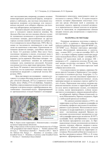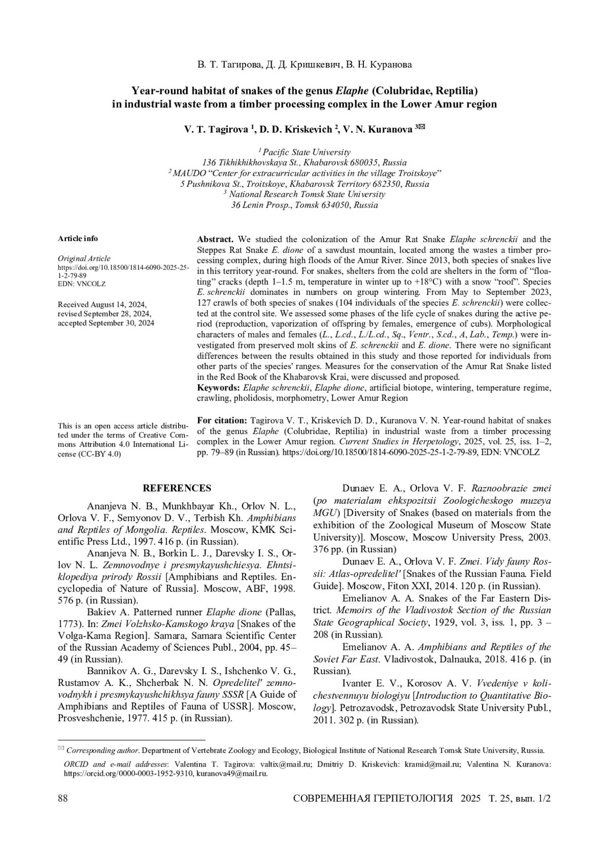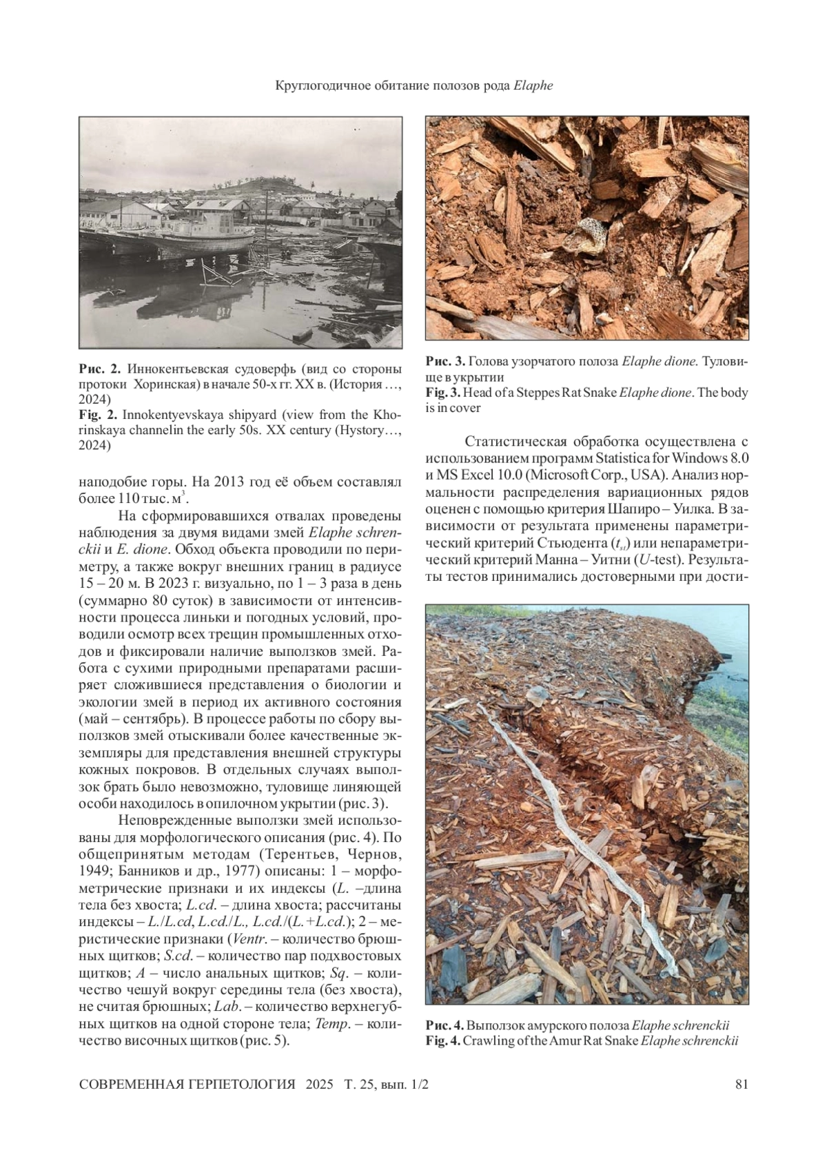 Изучено заселение амурским полозом Elaphe schrenckii и узорчатым полозом E. dione опилочной «кучи», расположенной среди отходов лесоперерабатывающего комплекса, в период высоких паводков р. Амур. Полозы обоих видов обитают здесь круглогодично с 2013 г. Убежища в виде «парящих» трещин (глубина 2 - 2.5 м, температура зимой до +18°С) со снежной «крышей» над ними служат змеям укрытиями от холодов. На групповой зимовке по численности доминирует E. schrenckii. С мая по сентябрь 2023 г. на контрольной площадке собрано 127 выползков обоих видов полозов (из них - 104 E. schrenckii), проведена косвенная оценка ряда фаз их жизненного цикла в активный период (размножение, выпаривание самками потомства, появление сеголеток). По сохранившимся линным шкурам E. schrenckii и E. dione исследованы морфологические признаки самцов и самок (L., L. cd., L./L. cd., Sq., Ventr., S. cd., A, Lab., Temp.). Обсуждены и предложены мероприятия по сохранению иннокентьевской популяции полозов, обитающих в опилочной «куче».