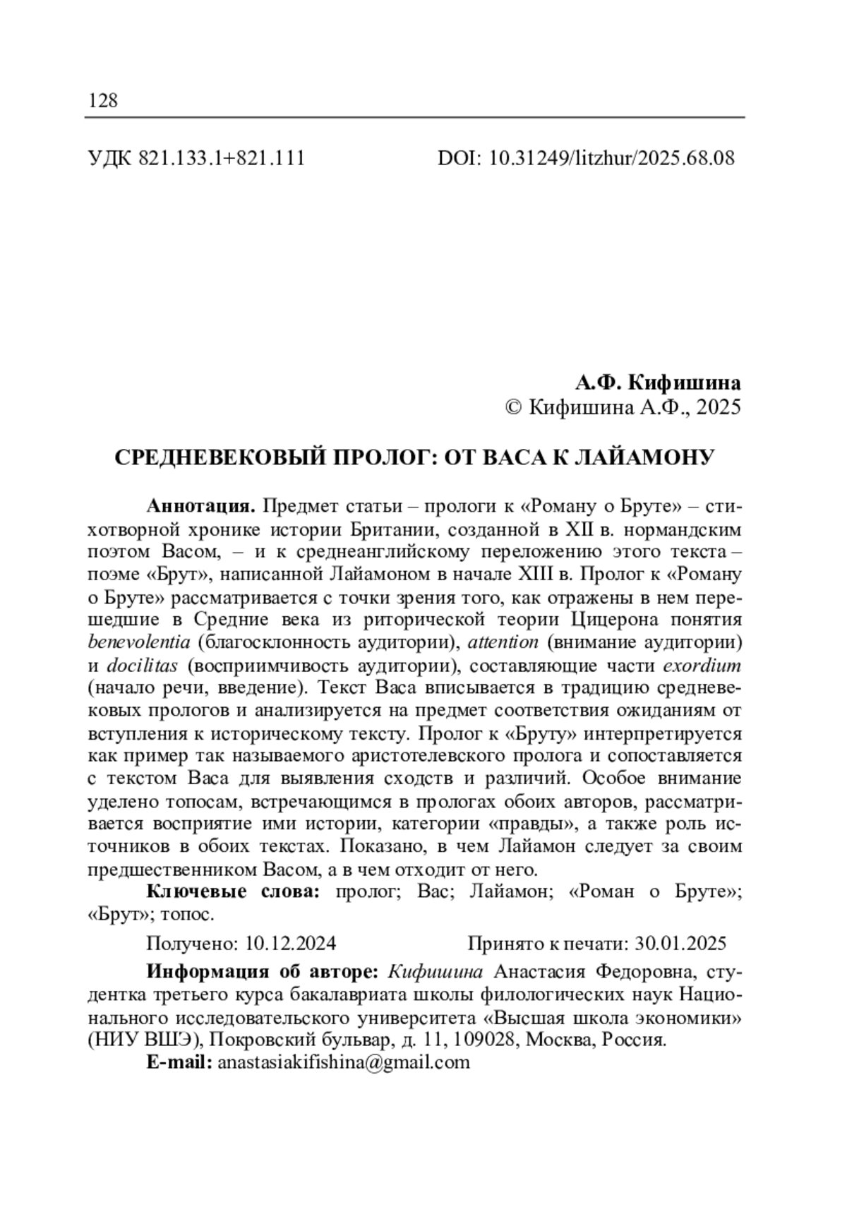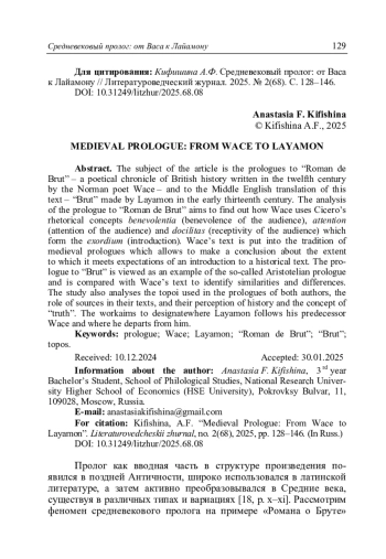 Кифишина А.Ф. Средневековый пролог: от Васа к Лайамону // Литературоведческий журнал. 2025. No 2(68). С. 128–146.