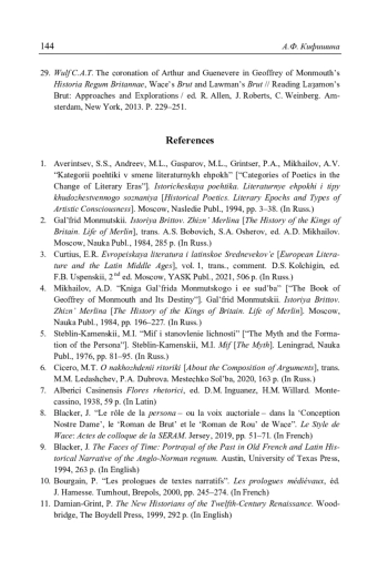 28. Wickham-Crowley K.M. Laȝamon’s Narrative Innovations and Bakhtin’s Theories // The Text and Tradition of Laȝamon’s Brut / ed. F. le Saux. Cambridge: D.S. Brewer, 1994. P. 207-225.