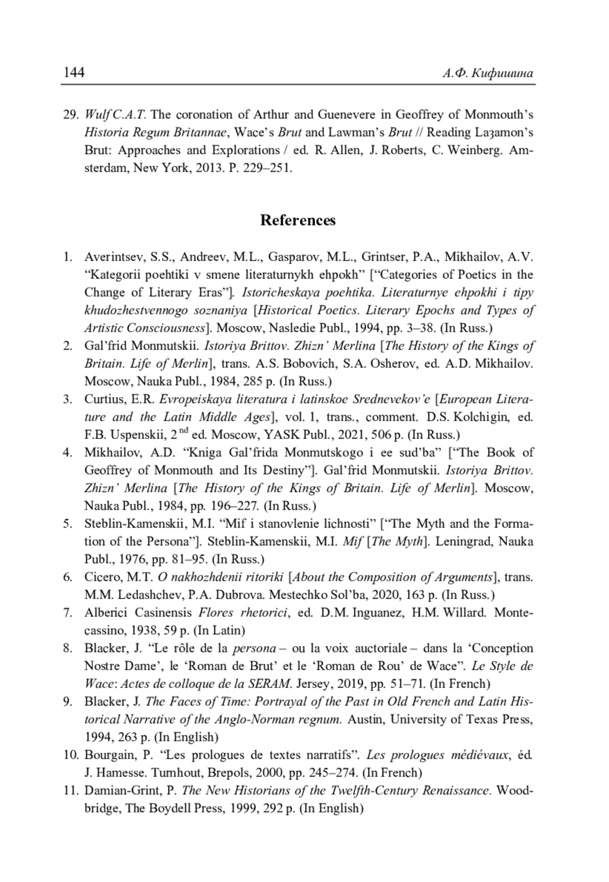 22. Mathey-Maille, L. “Traduction et création: de l‘Historia Regum Britanniae de Geoffroy de Monmouth au Roman de Brut de Wace”. Écriture et modes penseé au Moyen Âge: VIIIe-Xve siècles, éd. D. Boutet, L. Harf-Lancner. Presses de l’École normale supérieure, 1993, pp. 187–193. (In French)