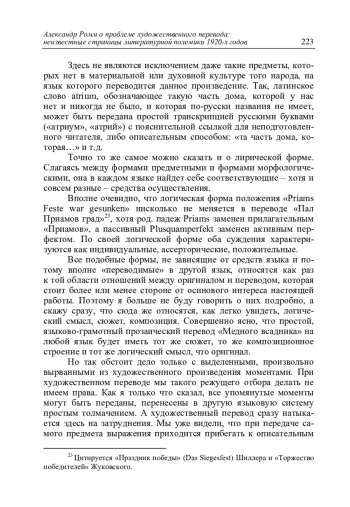 In the 1920s, Soviet literary criticism engaged in an active debate on the fundamental principles of translating literary texts. Today, pioneering works by M. Alekseev, A. Fedorov, A. Smirnov, and others are well known. However, overshadowed by these figures were the theoretical contributions of poet, philologist, and translator Aleksandr Ilyich Romm (1898-1943), presented in a report at the State Academy of Artistic Sciences in the spring of 1925. Thanks to the writer’s extensive drafts and notes preserved in his archive, we can attempt to reconstruct his original perspective on the problem of literary translation, which, in many ways, foreshadowed the achievements of 20 th century Russian and Western translation studies.