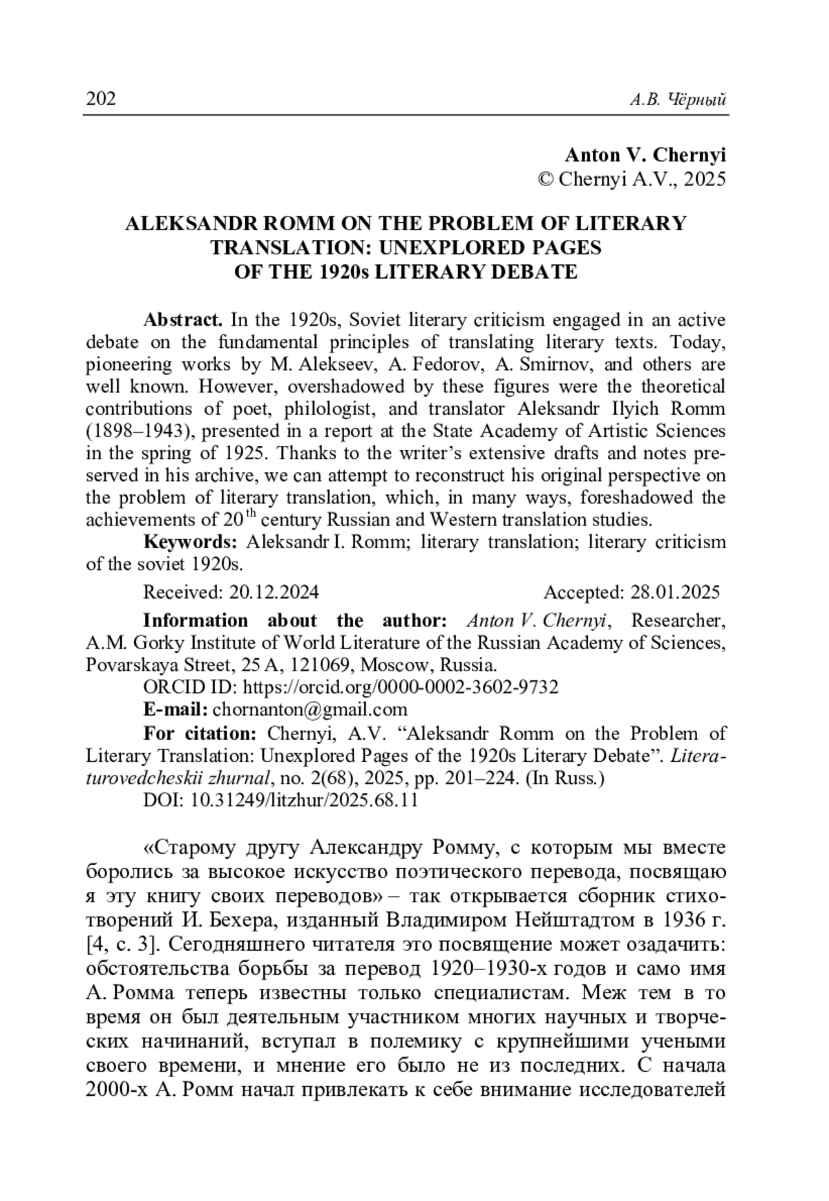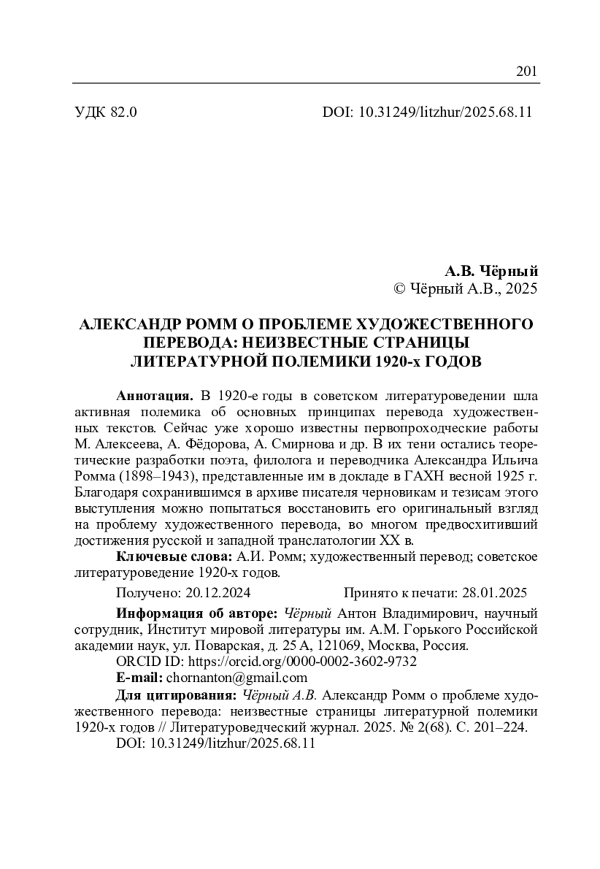 Чёрный А.В. Александр Ромм о проблеме художественного перевода: неизвестные страницы литературной полемики 1920-х годов // Литературоведческий журнал. 2025. No 2(68). С. 201–224.