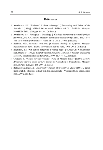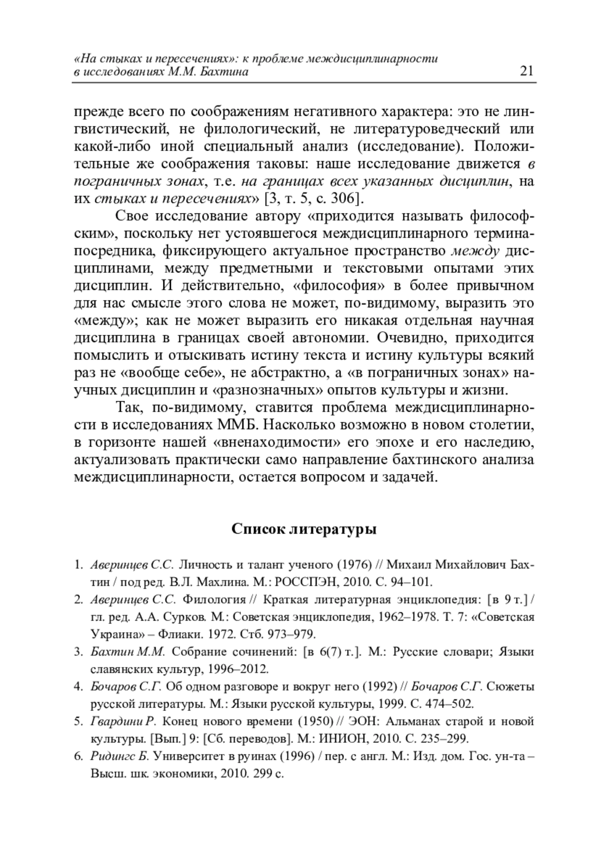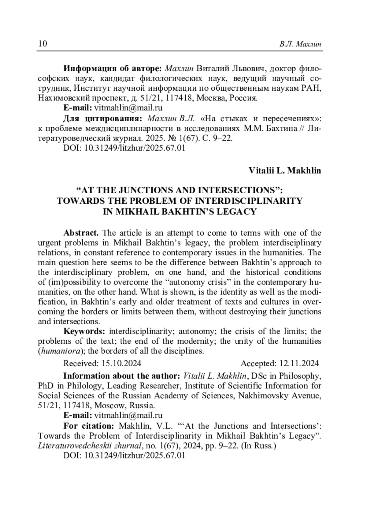 Махлин В.Л. «На стыках и пересечениях»: к проблеме междисциплинарности в исследованиях М.М. Бахтина // Литературоведческий журнал. 2025. No 1(67). С. 9–22.