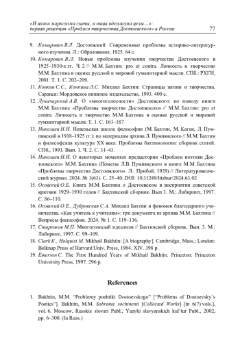 6. Vishlenkova, S.G., Marinichenko, A.I. “‘Problemy poehtiki Dostoevskogo’ M.M. Bakhtina v personal’nykh traektoriyakh zapadnoi retseptsii 1960–1970-kh godov” [“Mikhail Bakhtin’s ‘Problems of Dostoevsky’s Poetics’ Through the Personal Trajectories of Western Reception in the 1960–1970 s”]. Literaturovedcheskii zhurnal, no. 1(63), 2024, pp. 89–109. (In Russ.) DOI: 10.31249/litzhur/2024.63.05
