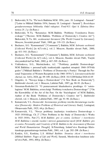 15. Osovskii, O.E. “Kniga M.M. Bakhtina o Dostoevskom v vospriyatii sovetskoi kritiki 1929–1930 godov” [“M.M. Bakhtin’s Book on Dostoevsky in the Perception of Soviet Criticism in 1929–1930”]. Bakhtinskii sbornik, vol. 3. Moscow, Labirint Publ., 1997, pp. 86–110. (In Russ.)