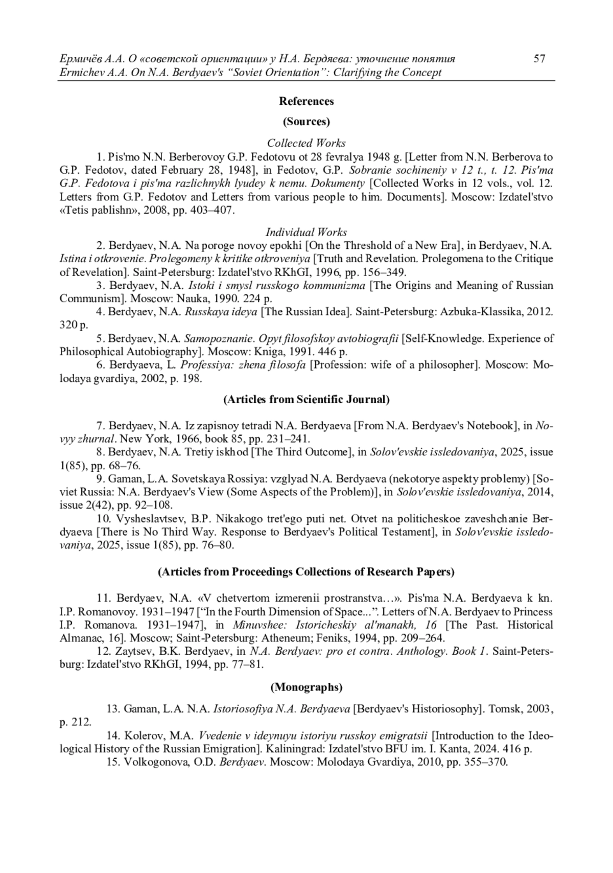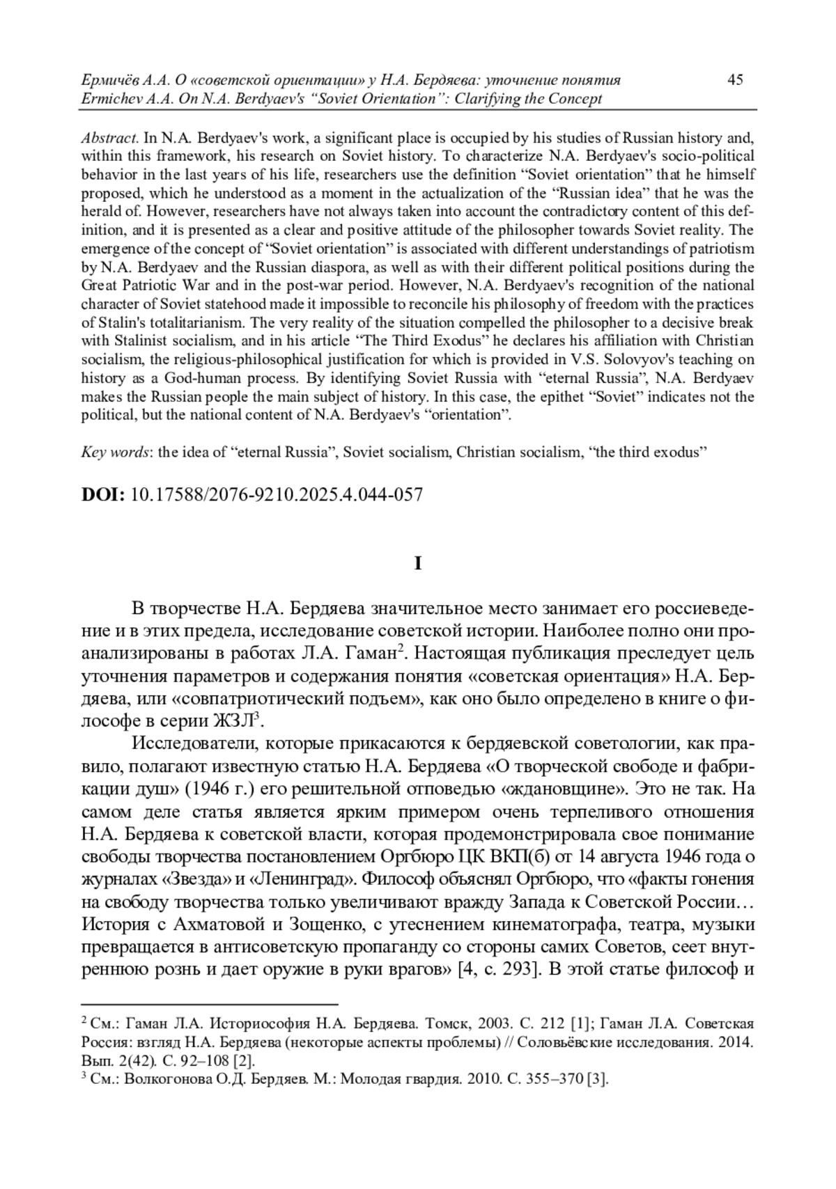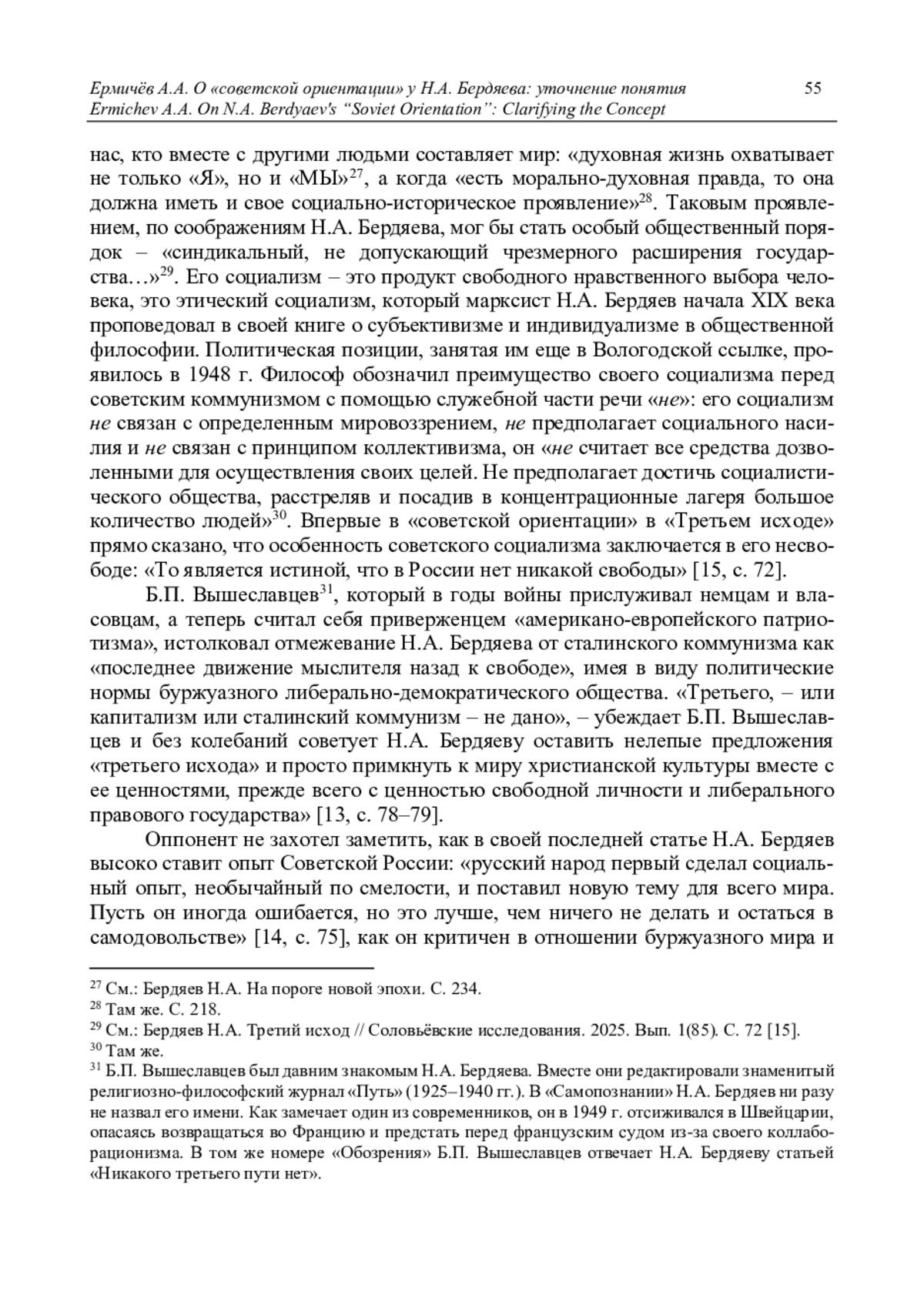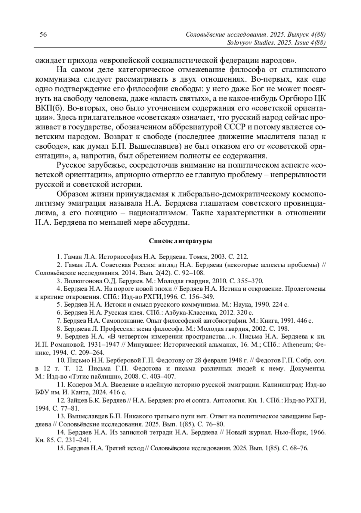 В творчестве Н. А. Бердяева значительное место занимает его россиеведение и в этих пределах, исследование советской истории. Для характеристики общественно-политического поведения Н. А. Бердяева последних лет его жизни исследователи используют им же предложенное определение «советская ориентация», которую сам мыслитель понимал как момент в актуализации «русской идеи». Исследователи не всегда учитывают противоречивое содержание этого определения, подавая его как однозначно позитивное отношение к советской действительности. Возникновение самого понятия «советская ориентация» связано с различным пониманием патриотизма у Н. А. Бердяева и русского зарубежья и с их разными политическими позициями в Великую Отечественную войну и в послевоенное время. Однако признание Н. А. Бердяевым национального характера советской государственности сделало невозможным примирение его философии свободы с практикой советского тоталитаризма. Сама действительность вынудила философа к решительному отмежеванию от сталинского социализма, и в статье «Третий исход» он заявляет о своей принадлежности к христианскому социализму, религиозно-философское обоснование которого дано в учении В. С. Соловьева об истории как Богочеловеческом процессе. Отождествляя Советскую Россию и «Россию вечную», Н. А. Бердяев делает главным субъектом истории русский народ. В этом случае эпитет «советская» указывает не на политическое, а на национальное содержание «ориентации» Н. А. Бердяева.