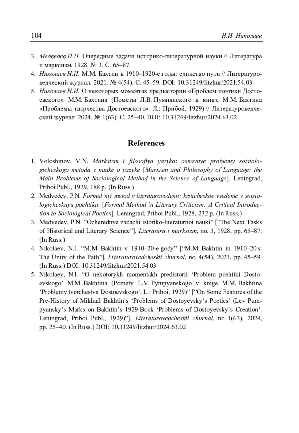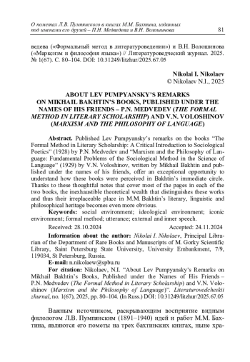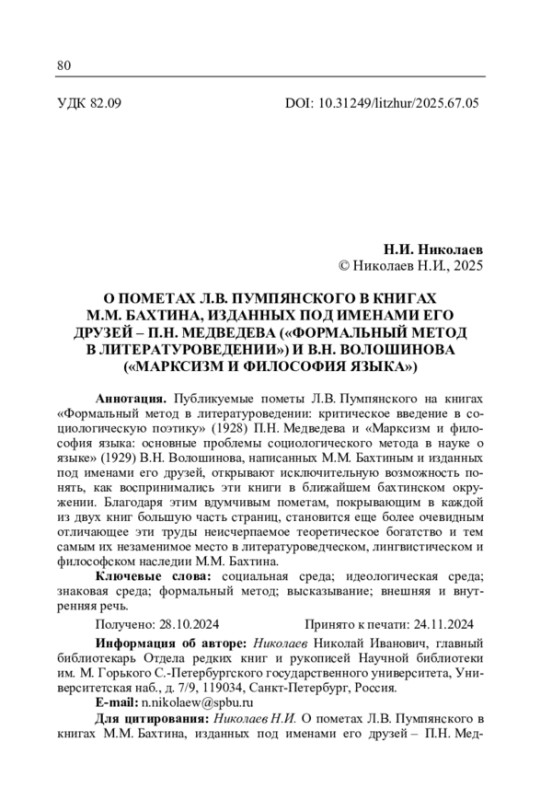 книгах М.М. Бахтина, изданных под именами его друзей – П.Н. Медведева («Формальный метод в литературоведении») и В.Н. Волошинова («Марксизм и философия языка») // Литературоведческий журнал. 2025. No 1(67). С. 80–104.