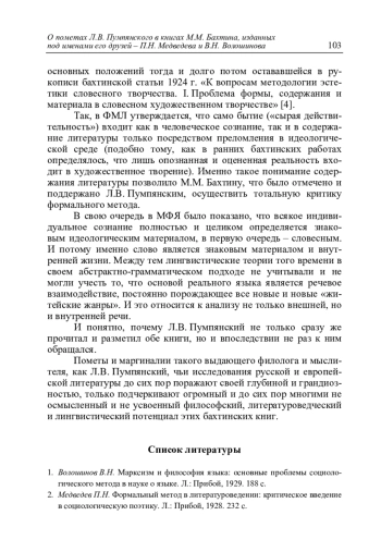 Published Lev Pumpyansky’s remarks on the books “The Formal Method in Literary Scholarship: A Critical Introduction to Sociological Poetics” (1928) by P. N. Medvedev and “Marxism and the Philosophy of Language: Fundamental Problems of the Sociological Method in the Science of Language” (1929) by V. N. Voloshinov, written by Mikhail Bakhtin and published under the names of his friends, offer an exceptional opportunity to understand how these books were perceived in Bakhtin’s immediate circle. Thanks to these thoughtful notes that cover most of the pages in each of the two books, the inexhaustible theoretical wealth that distinguishes these works and thus their irreplaceable place in M. M. Bakhtin’s literary, linguistic and philosophical heritage becomes even more obvious